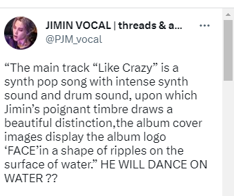 , множество песни от предстоящия албум на Джимин били счетени за неподходящи за излъчване от KBS. Това са три от песните - Face-off, Like crazy и Alone. Face-off, композиран от RM, била счетена за неподходяща заради текстовете съдържащи ругатни, жаргон и неприличен език. Е, нямам търпение да я чуя.