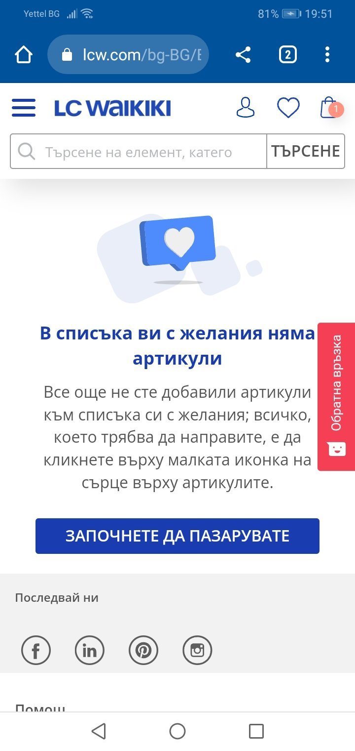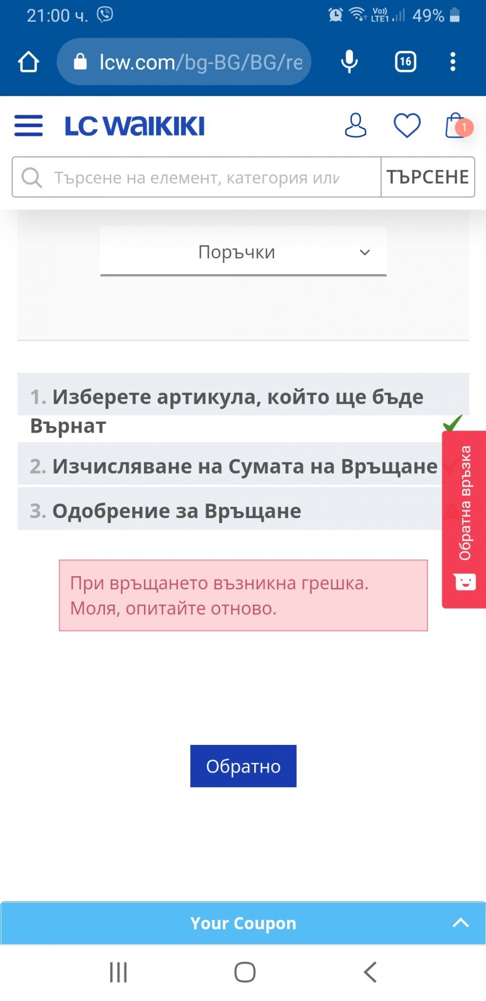 В продължение на почти две седмици ми даваше този надпис,и не става,и не става.Два пъти говорих с тях,уж да съдействат,но така и не ме посети куриер.И точно вече се бях отказала,реших да пробвам за последно да заявя връщане през сайта,и то взе, че стана.Но дадох връщане на парите в LCW пари,тъй като бях платила с наложен платеж.