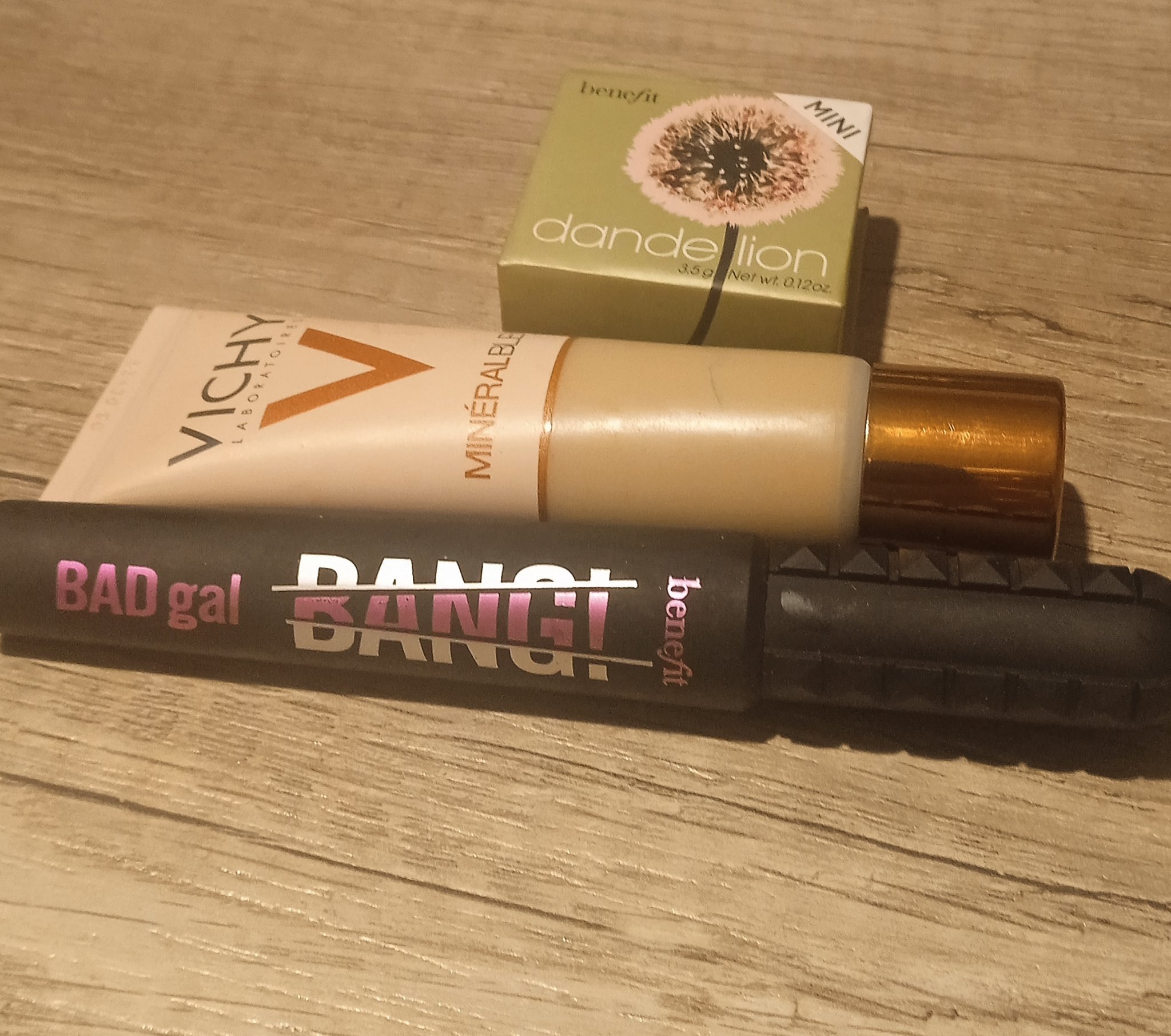 Разменям спирала Benefit BADgal BANG! Volumizing Mascara, руж Benefit Dandelion mini и фон дьо тен Vichy mineral blend цвят 06 ochre. И трите продукта са само тествани.
