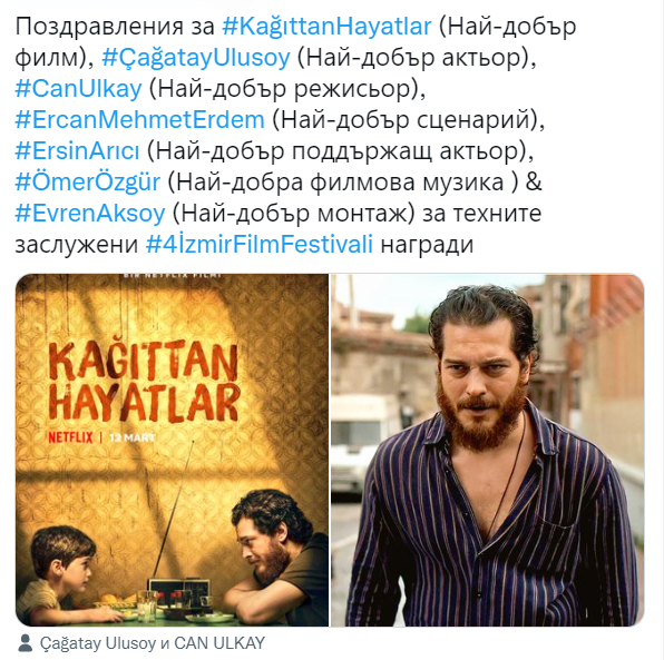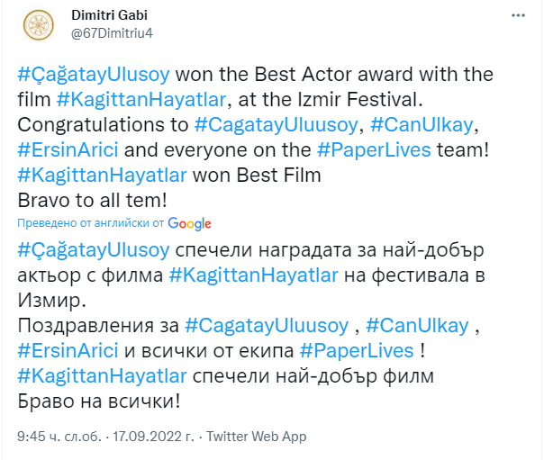 Честито на Чаатай Улусой и целия екип на "Хартиени животи". Заслужени награди.
