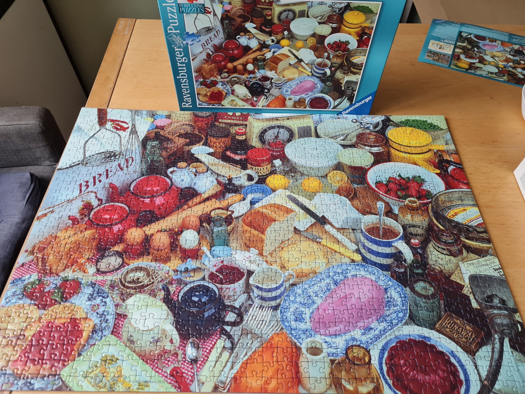 Аз съм ограничила пъзелите до гаража и хола, от стаята на децата и спалнята съм ги махнала. Но между дивана и прозореца има пъзели, в раклата на дивана е пълно. Бюрото за онлайн обучение на децата също. Върху етажерката е най-голямата колекция. В  гаража май са над 20 пъзела. Вчера поръчах помагалата на малкия от озон и забърсах и един пъзел Simple Smile