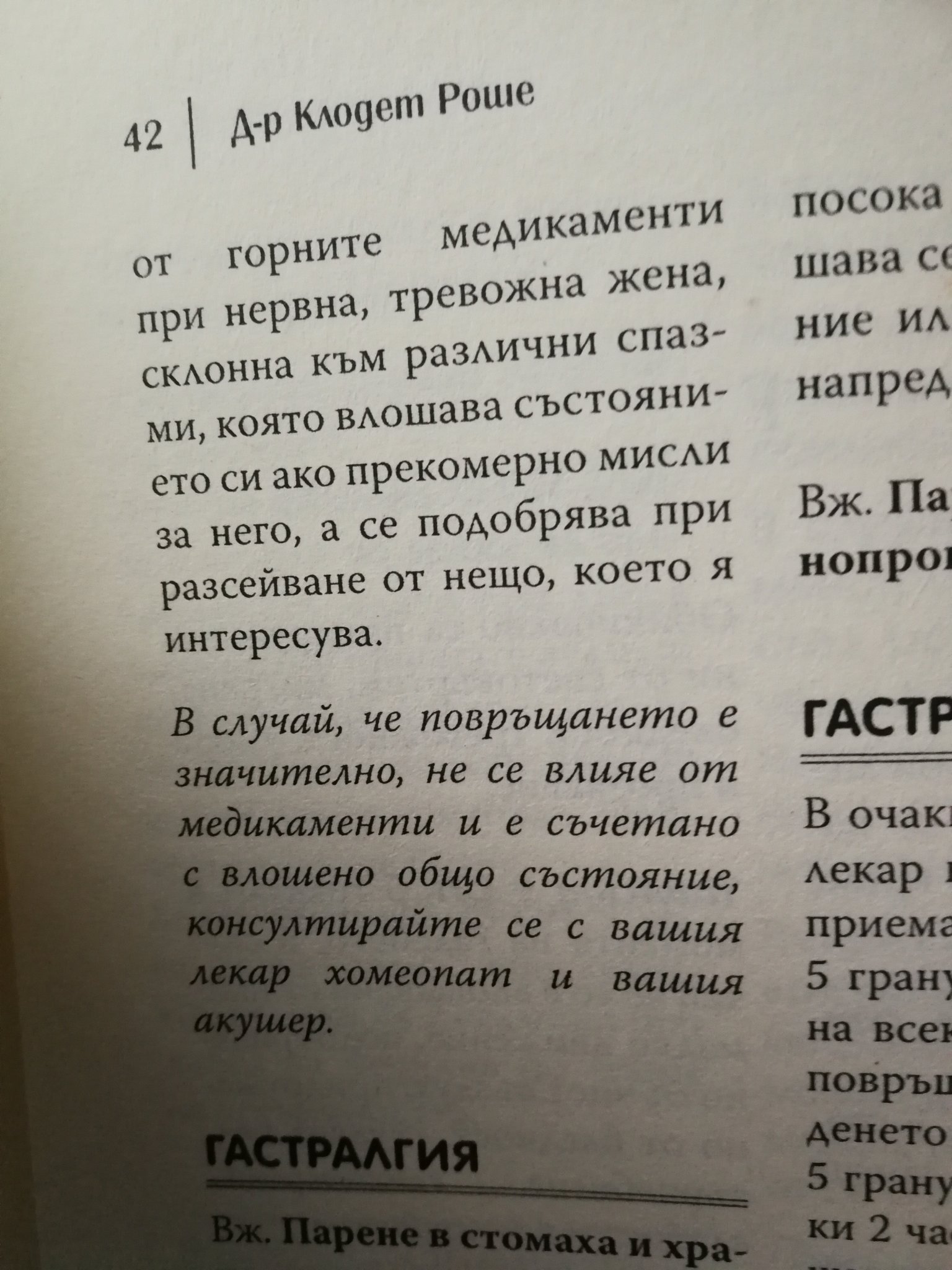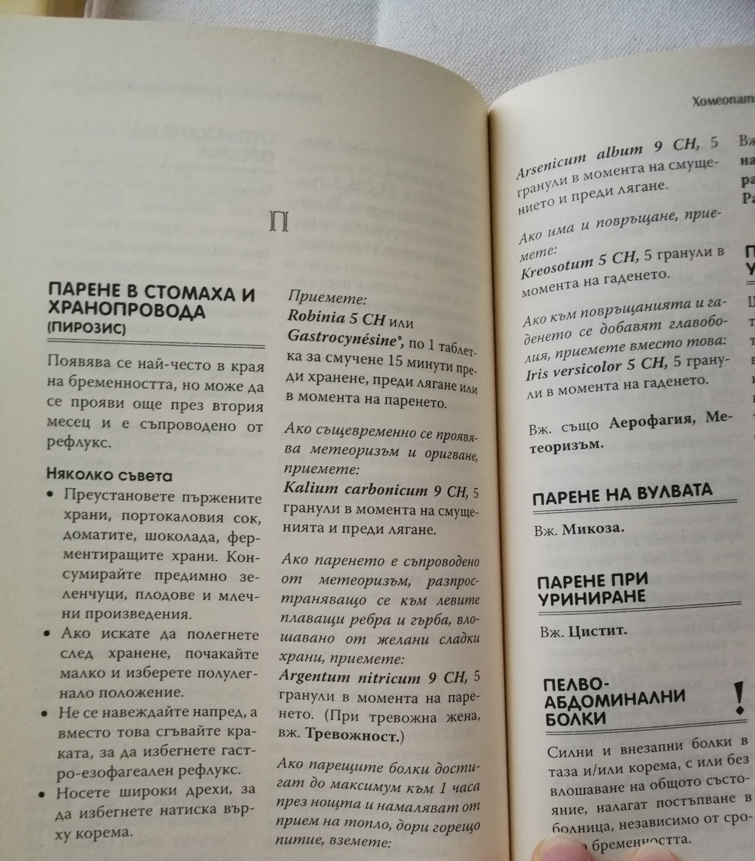Имам книга "Хомеопатия за бременни". Ето това е разделът за киселините и под него за гадене и повръщане. Общото лекарство за гадене Sepia в разреждане 30СН направи чудеса с повръщането ми, спря ги от раз. По-късно пак повръщах много пъти, но по-рядко, а не по няколко пъти на ден. От него чувствително ми намалява и гаденето. Мойта АГ ми препоръча една хранителна добавка Емо Стоп, с джинджифил и мента, която е ок за бременни, и тя ми помага. Няма я в наличност, а само след поръчка. Тези двете в комбинация ми помагат да се чувствам почти добре. Но аз повръщам от гаденето, не от киселините, макар че ми се връща храна в гърлото. Затова показвам всички хомеопатични лекарства, дано някое ви помогне.