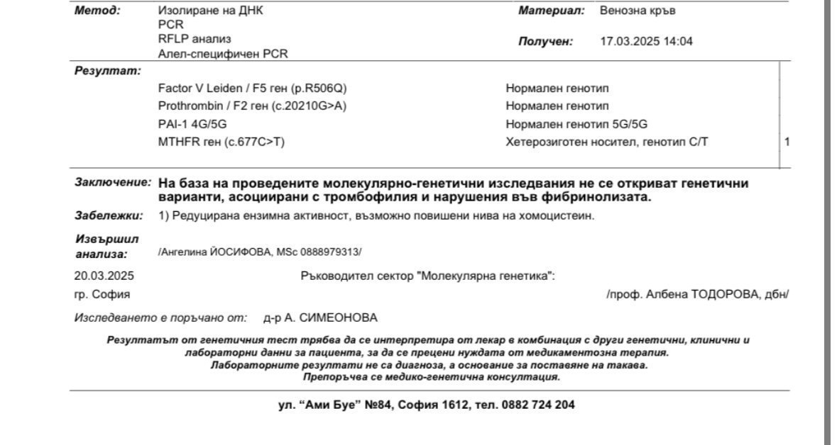 Не мога да дам мнение за изследването, но мога за лекаря назначил ги. Изключително недоволна съм от Ангелина Симеонова. Големи пропуски, мотане с години, казва пратете ми на вайбър резултатите, нулев отговор. Като цяло загуба на време. А тук става дума и за тромбофилия, тотално няма да й се доверя и бих потърсия консултация с хематолог.
