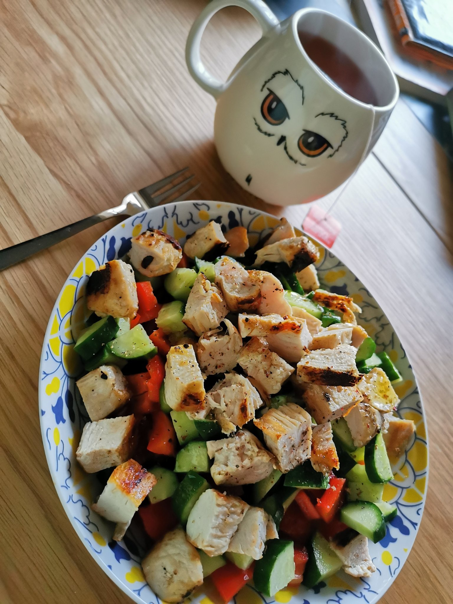 Скоро не съм се показвала: пуешко филе на грил тиган, 1 краставица, 1 зелена и 1 червена чушка, сол, зехтин, черен пипер, чай от цвекло, джинджифил и листа от къри.