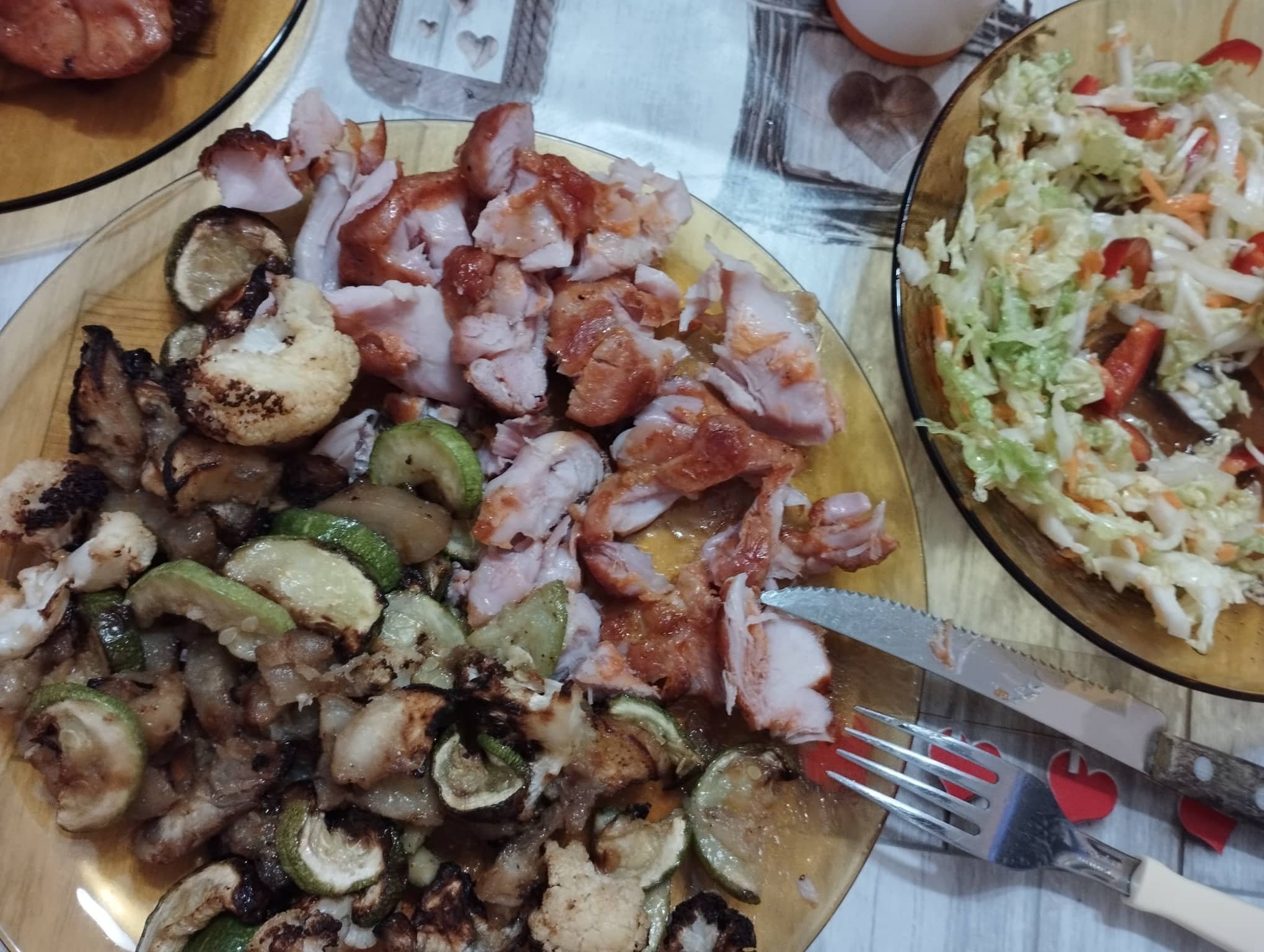 Гледам за манджи си говорите - при мен пил. чеснови крилца+огромна салата и пиле с праз, морков и чушка - като кавърма. ❤️