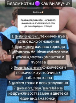 Първа ми се струва, че ще е Веселина, не може да са я вкарали само за седмица, просто такъв образ не вярвам да го изпуснат. Зависи от играта, някой баланс с делва и момчетата може да окапят.