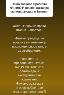 Филип дори не се е жалвал за единствената си досега номинация, по начина, по който го направи Виктория, например, така че оплакващите го коментари не са породени от неговите действия, далеч съм от мисълта и че нехаресването на Жени води до тях, защото дори Тодор от втори сезон беше представен като жертва на Ваня, въпреки откровената агресия, която многократно е проявявал към нея и към други участници в предаването. Дискусията е породена от различните виждания на участващите в нея, не мисля, че има общо с конкретен участник, дори и да изглежда така на пръв поглед.