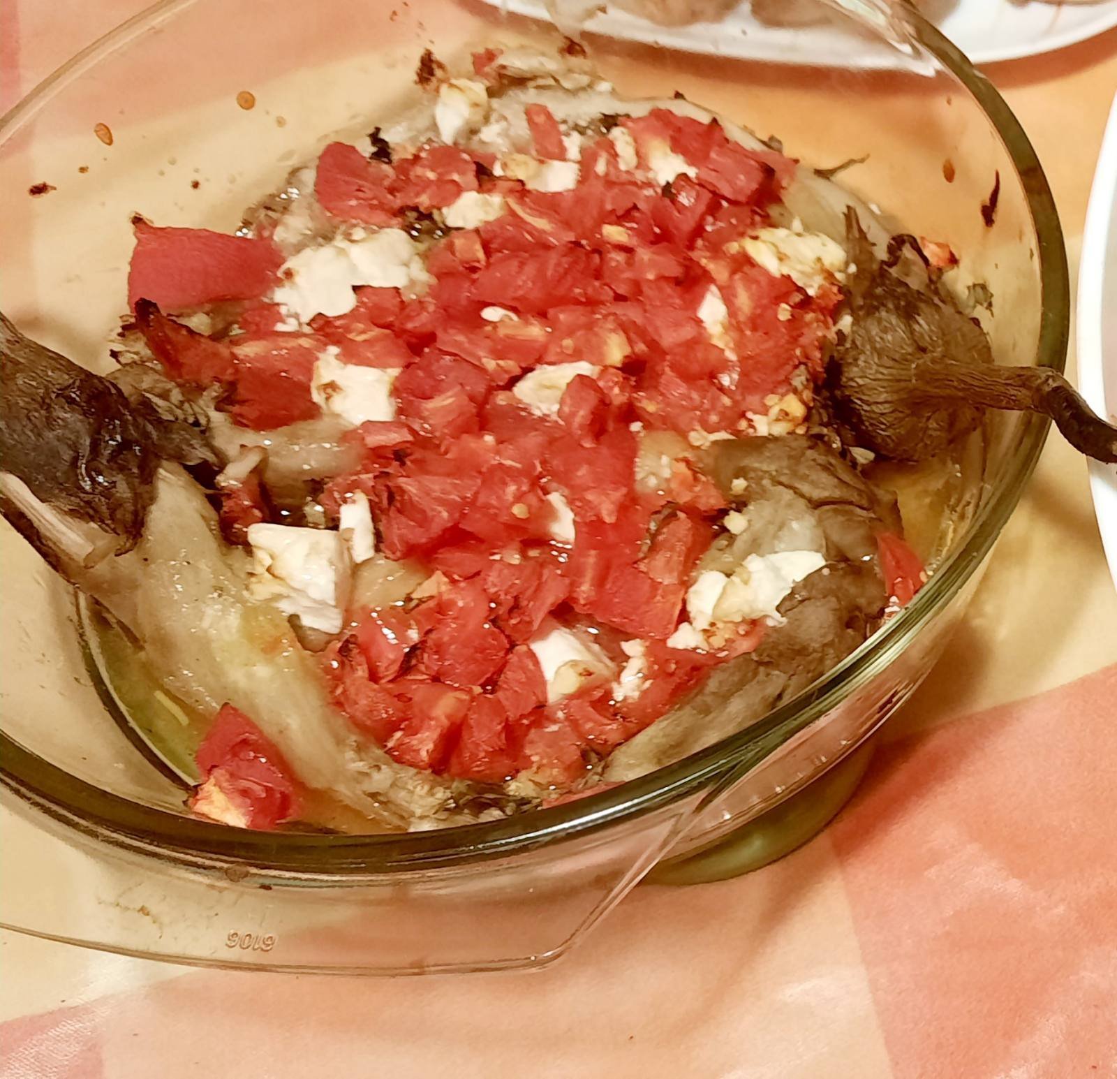 1 патладжан, 1 домат, бяло саламурено сирене, зехтин, риган магданоз
