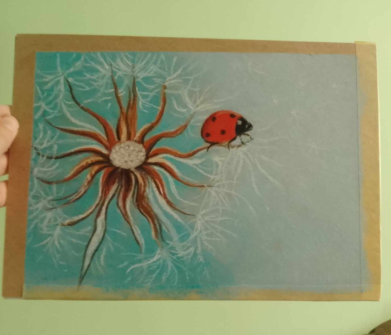 Нарисувах калинката от маратона - обаче излезе много бледа, защото нямах такова синьо в комплекта пастели (имам един по-нов, с повече цветове, но си го пазя):
