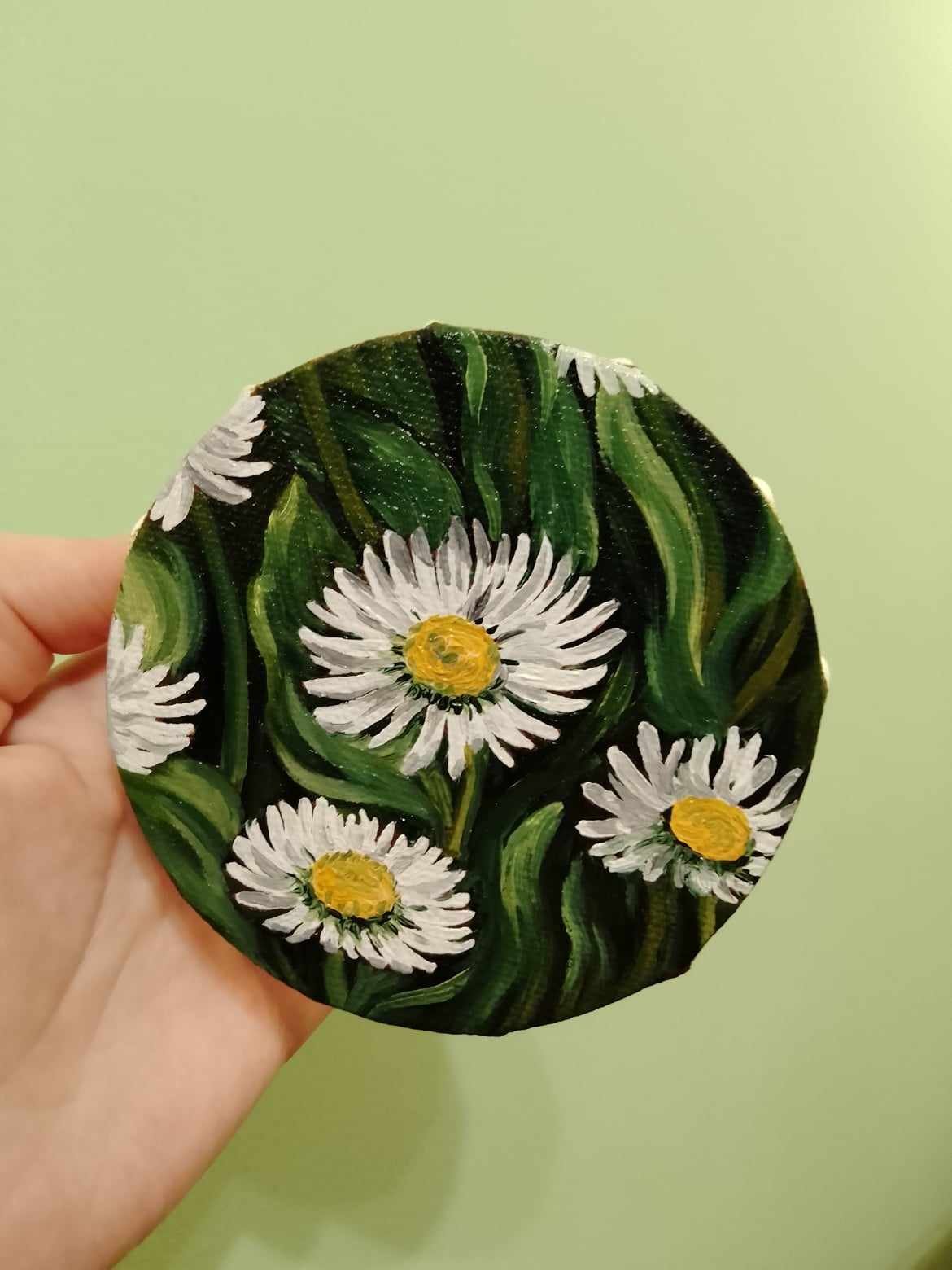 Върнах се към маргаритките - масло на мини платно (не съм сигурна дали са готови, може да ги променя малко):