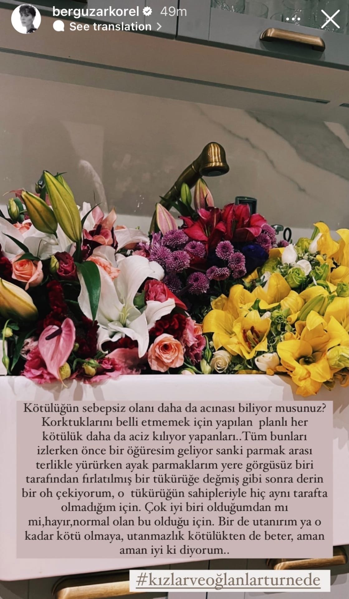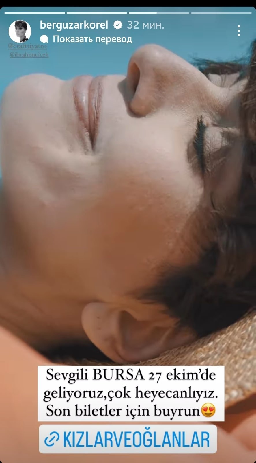 Я также очень рада нашей предстоящей игре в Бурсе Я знаю, что вы отмечали меня во многих сообщениях, но, поскольку я обычно не просматриваю свои личные сообщения, там есть сообщения недельной давности, поэтому я не могу просмотреть или поделиться фотографиями, о которых я упоминяну. Я прошу вас не понимать неправильно. Вот почему, отмечайте наш театр и фотографии, на которых вы отметьте меня, чтоб я смогла ими поделиться. Спасибо вам всем.