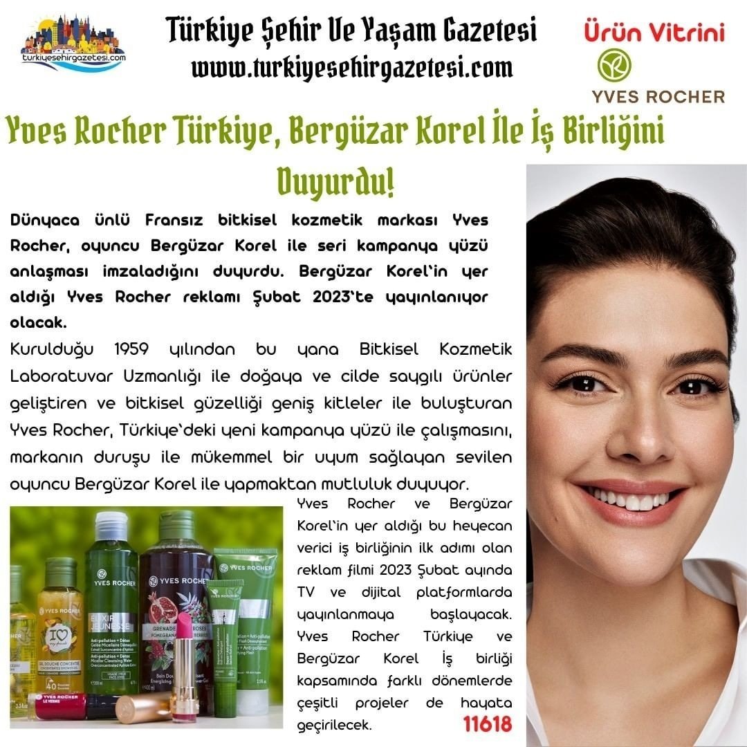 От пресата - "Yves Rocher, всемирно известный французский бренд косметики на травах, объявил о подписании соглашения о серийной рекламной кампании с актрисой Бергюзар Корель. Рекламный ролик Yves Rocher с участием Бергюзар Корель выйдет в эфир в феврале 2023 года."