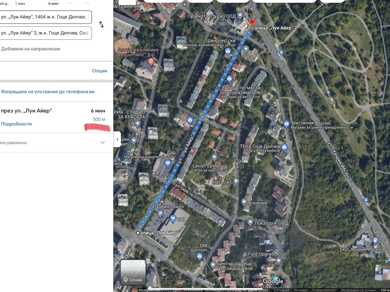 От Тодор Каблешков до пешеходната пътека на Луй Айер и парка са точно 500 метра. Като прибавим още 200 метра до кооперацията и още 10-20 метра широчина на булеварда до парка и общо става даже под 800 метра.