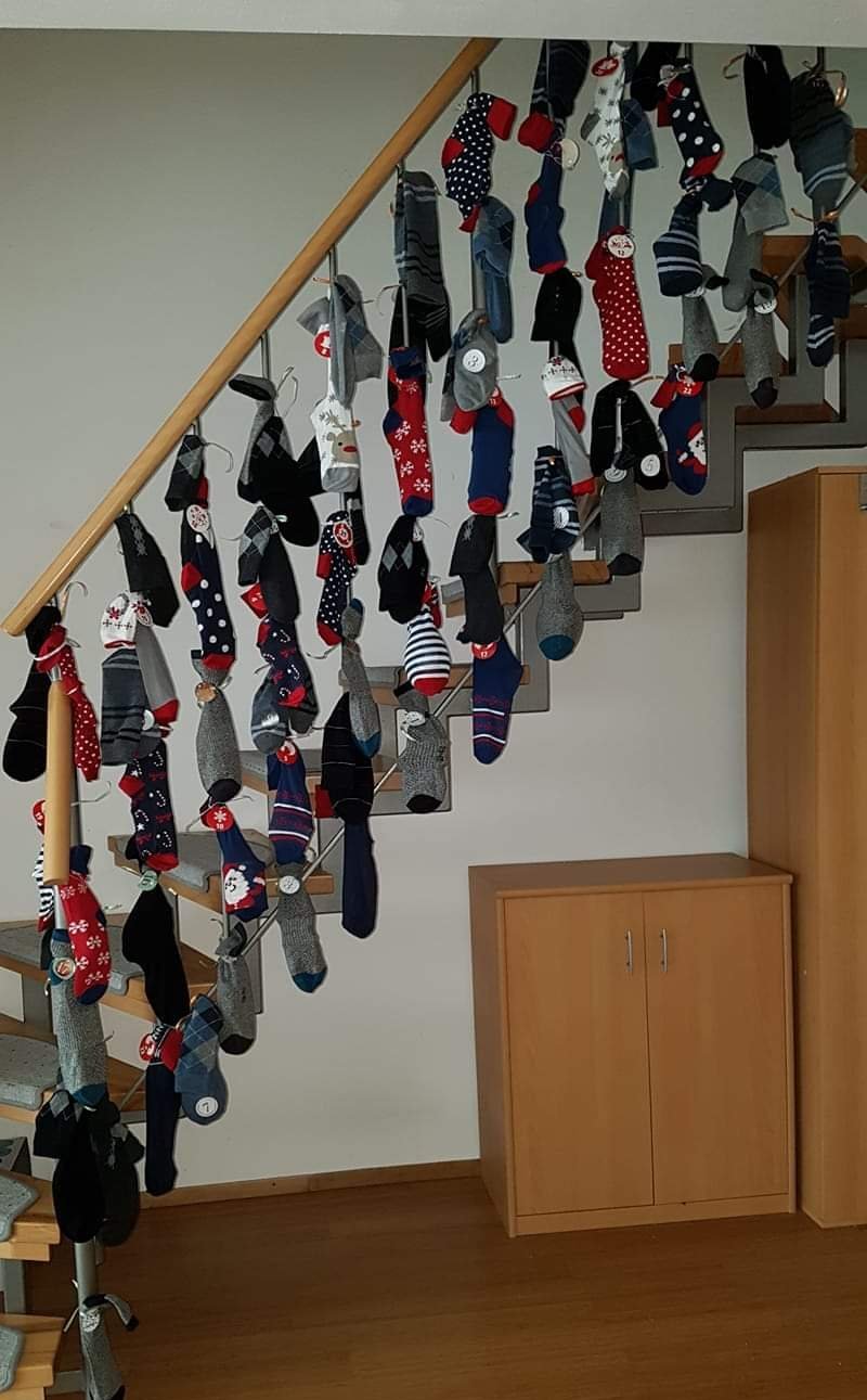 Купувате 12 чифта разноцветни чорапи по ваш вкус, дори не е нужно да са с коледни мотиви, слагате им номерца от 1 до 24 и закачате на подходящо място.