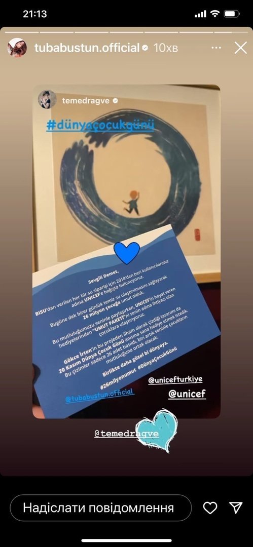 Туба е направила репост на Уницеф и по този случай е публикувала и послание от нея.