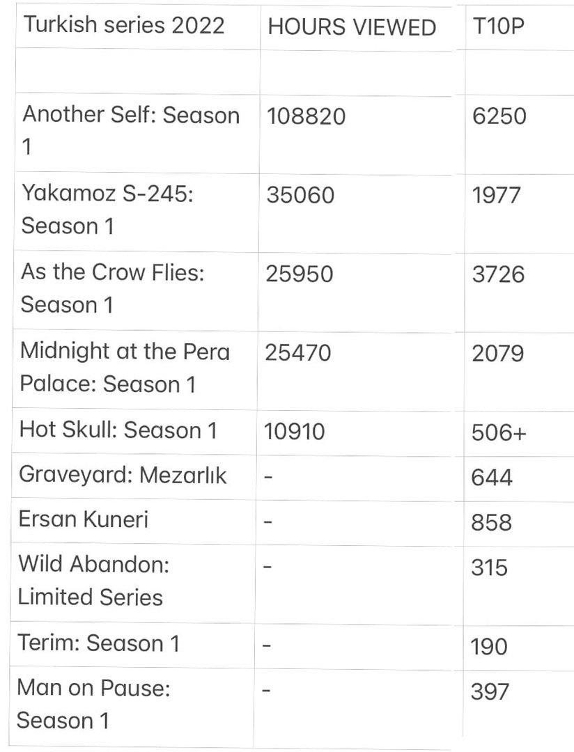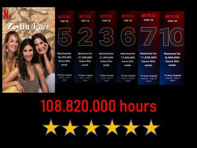 One turkish series was in the top 10 on netflix global for 6 weeks,in the top10 in 62 countries of the world,in the top10 in the UK,currently in the top100 on netflix global,only one was watched for 108million hours.These world successes were achieved by a series:#ZeytinAgaci