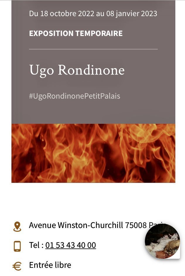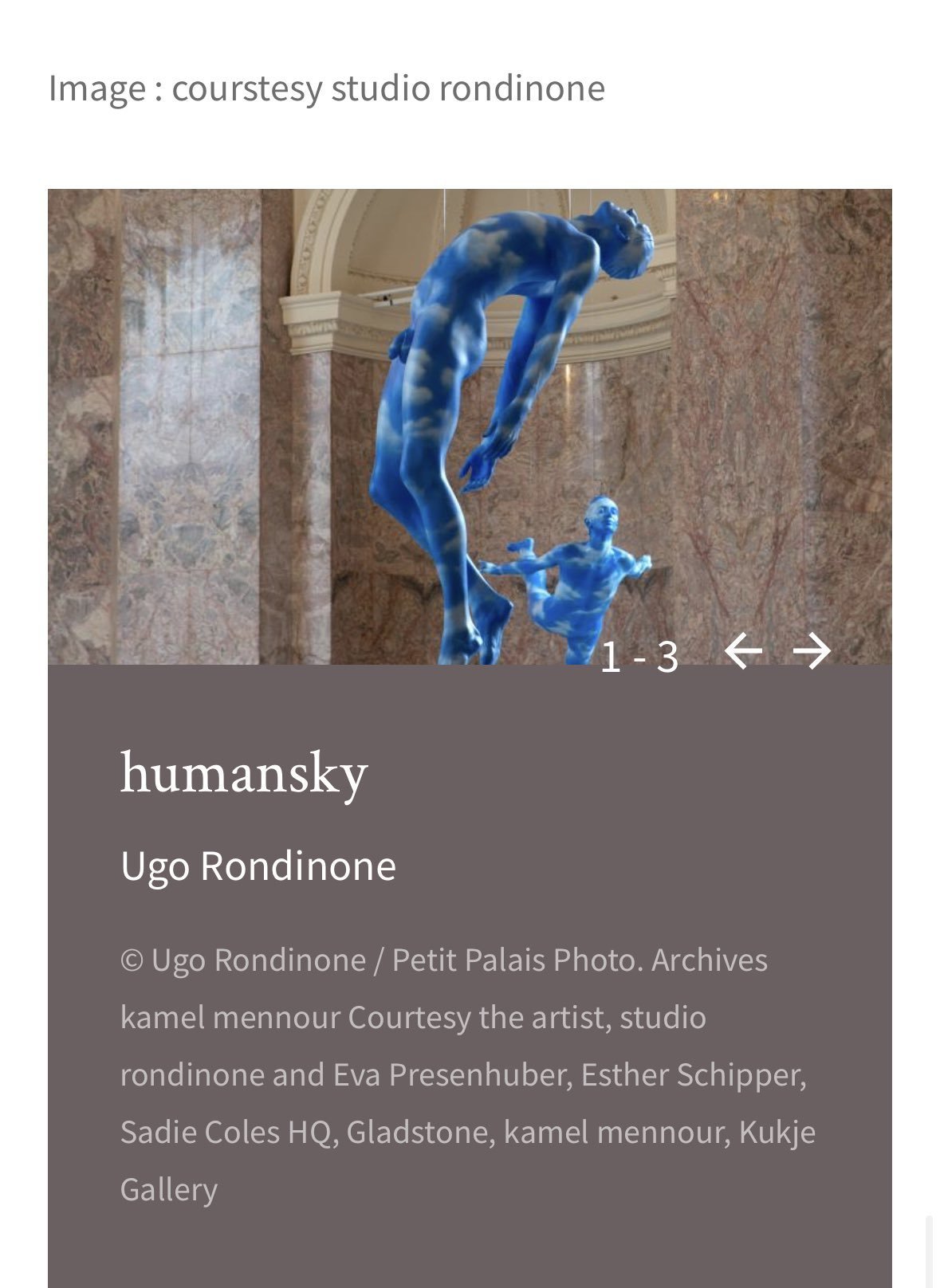 Выставка Уго Рондиноне (швейцарский скульптор живущий в Нью-Йорке ) в Малом дворце состоит из двух ансамблей работ, дополненных новой видеоинсталляцией. Эти работы, вращающиеся вокруг человеческих тел в контакте со стихиями и природой, соответствуют множеству семейств работ, созданных художником с конца 1980-х годов. Земля, небо, воздух, вода и огонь, связанные с существами в покое или в движении, вызываются во всей полноте их духовного измерения.