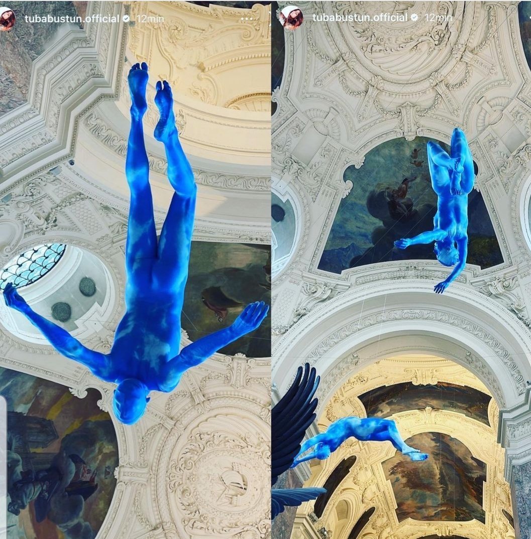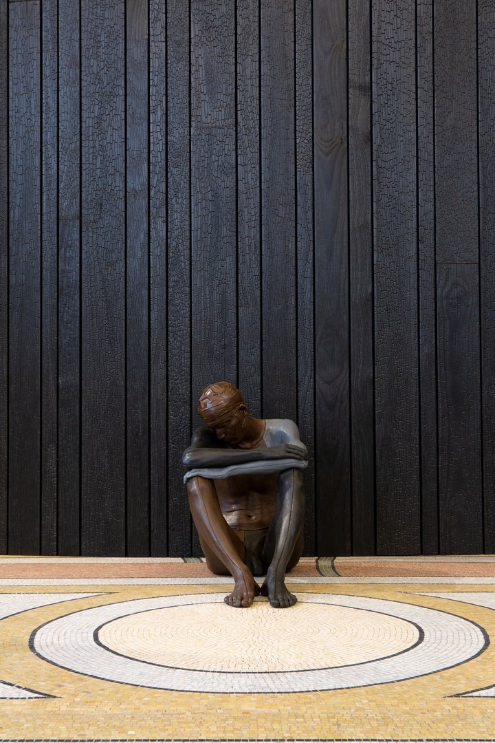 Первый ансамбль, человеческий, встречает посетителей и сразу подчёркивает слияние бытия и стихии: семь лепных, подвешенных тел, украшенных голубым усеянным облаками небом «камуфляж», противопоставляют посетителям воду и воздух.