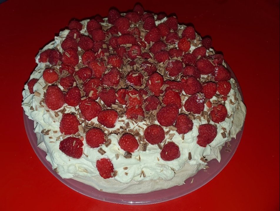 Но аз намалих с около 1/3 захарта във целувчения блат, защото 2 чаши ми се видяха много, а и добавих щедро шоколадов чипс. Друг момент, който ми се ще да отбележа, ако някой реши да се пробва е, че 1,15 часа във фурната е малко (или поне във моята фурна е малко) и хрупкавата част не беше особено солидна. Следващият път бих я оставила за 2 часа и още 2 при изключена И затворена фурна. Целта ми е да постигна повече хрупкава кора, която да контрастира на мекия център. За крема увеличих количеството на сметана спрямо маскарпонето с около 1/4 за да стане по-лек . Малините с киселия си привкус бяха идеални като контрапункт на крема и блата, но шоколадът, който ползвах за декорация не беше нищо особено - следващият път ще взема черен със сол или нещо по-шантаво - например балсамова редукция да речем. Цялото усещане от тъй нар. торта беше за лек и ароматен мус със плодове върху (не особено) крънчи блат с парченца шоколад. Със чаша Просеко беше чудесно (то какво ли не е).