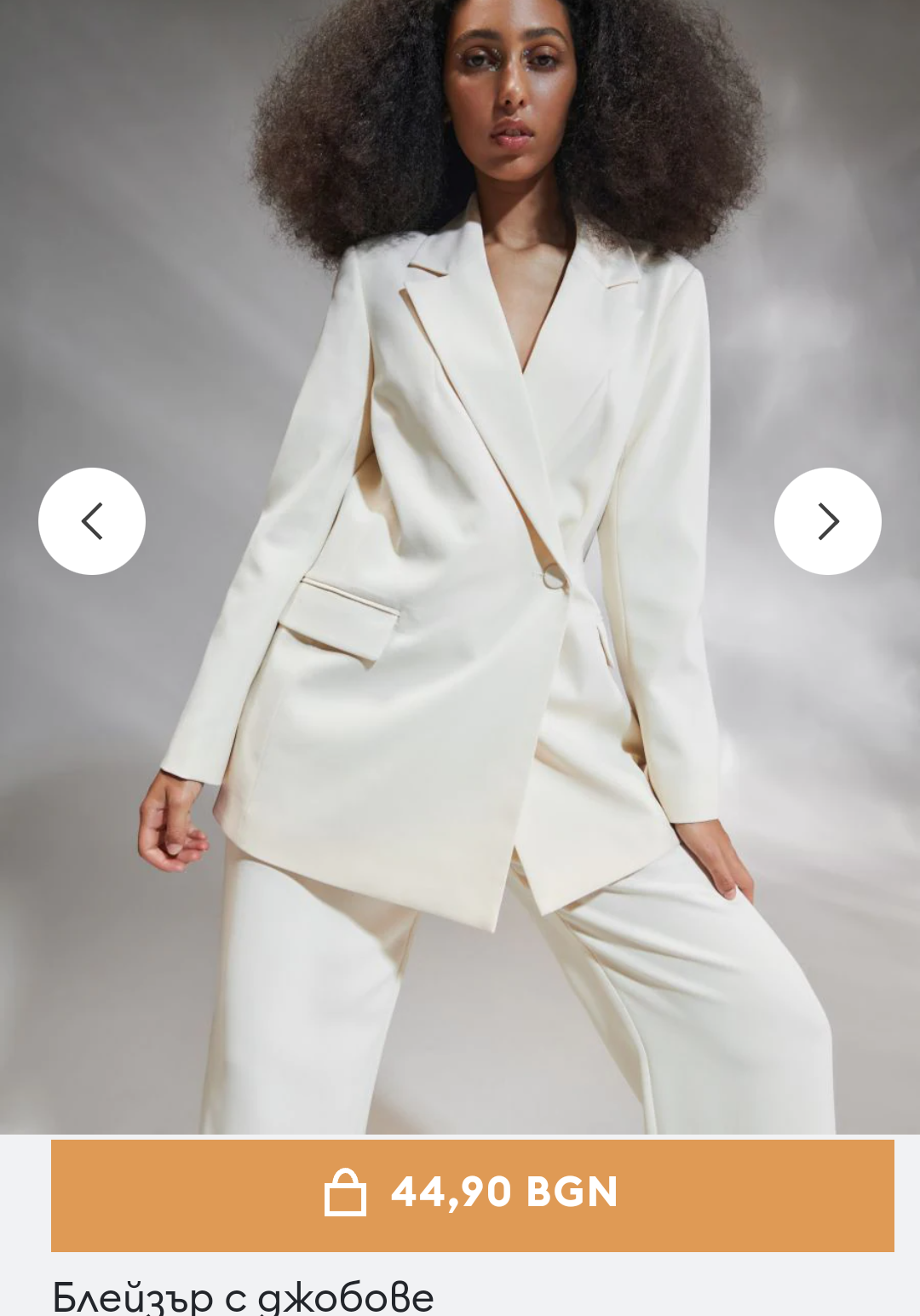 Цветът и материята са хубави, ама кройката е за високи, слаби и с широки рамене жени. Ръкавите са прекалено дълги. На снимката на жената ѝ са до китките, а на мен почти ми покрива пръстите. Откопчано стои малко голямо. Закопчано стои добре, вталено, но отчитам за минус, че няма подплънки...