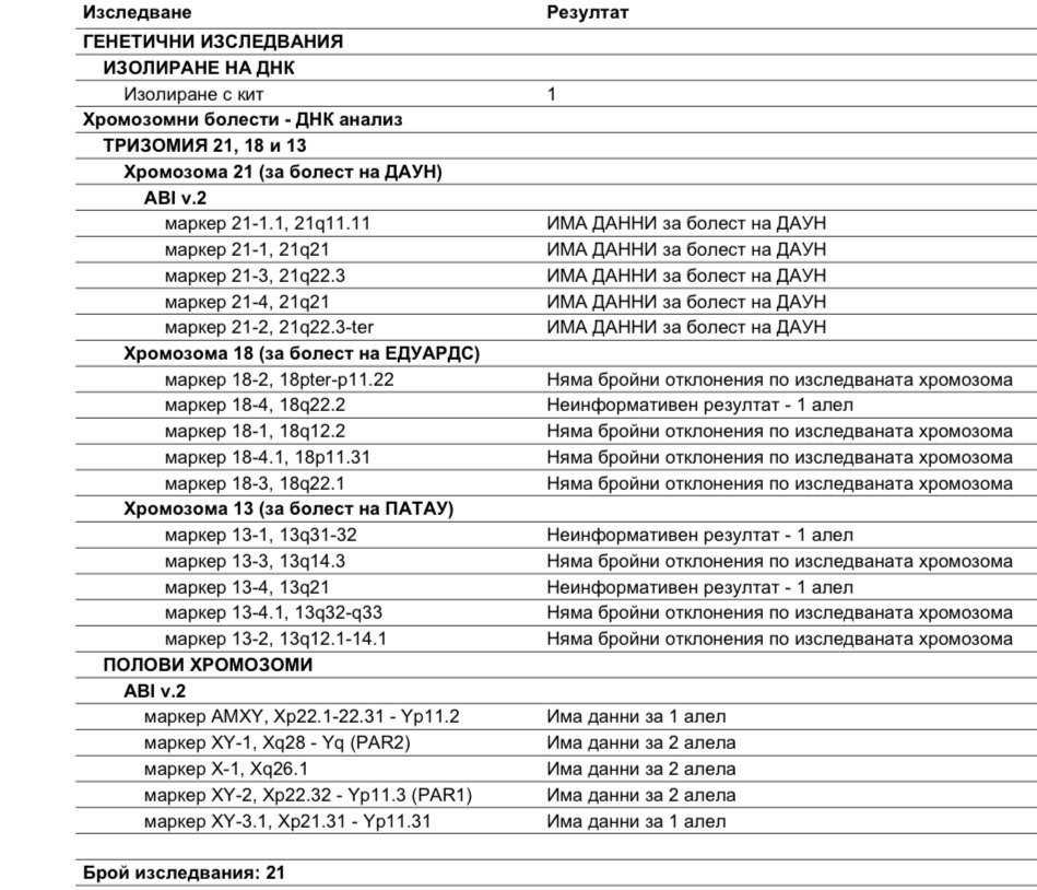 Не е правено в Геника, а в НГЛ. За половите хромозоми няма коментар, за Даун има коментар да се направи консултация с генетик. От болницата, където правих аборта, трябва да ми се обади генетик, за да обясни резултатите, но явно имат много работа и има забавяне.  Та до тогава ме гложди.