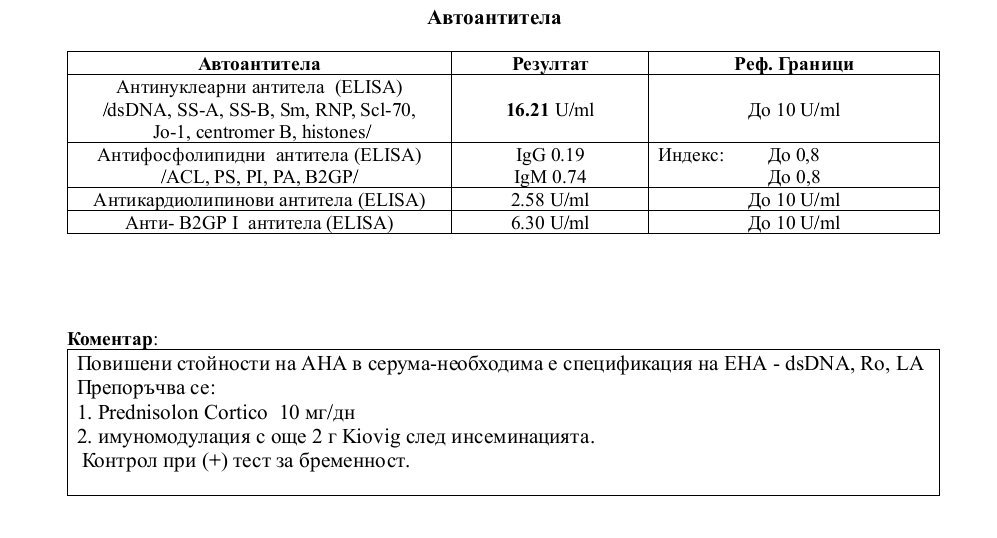 Нямам други установени проблеми. Пуснала съм кариотип, но чакам още резултат. Преди 3 дни правих трета инсеминация. Първата беше успешна, но завърши с биохимична бременност. С оглед коментара, дали трябва да правя вливка и терапия с кортикостероиди възможно най-скоро? Не съм правила влиивка преди инсеминацията.