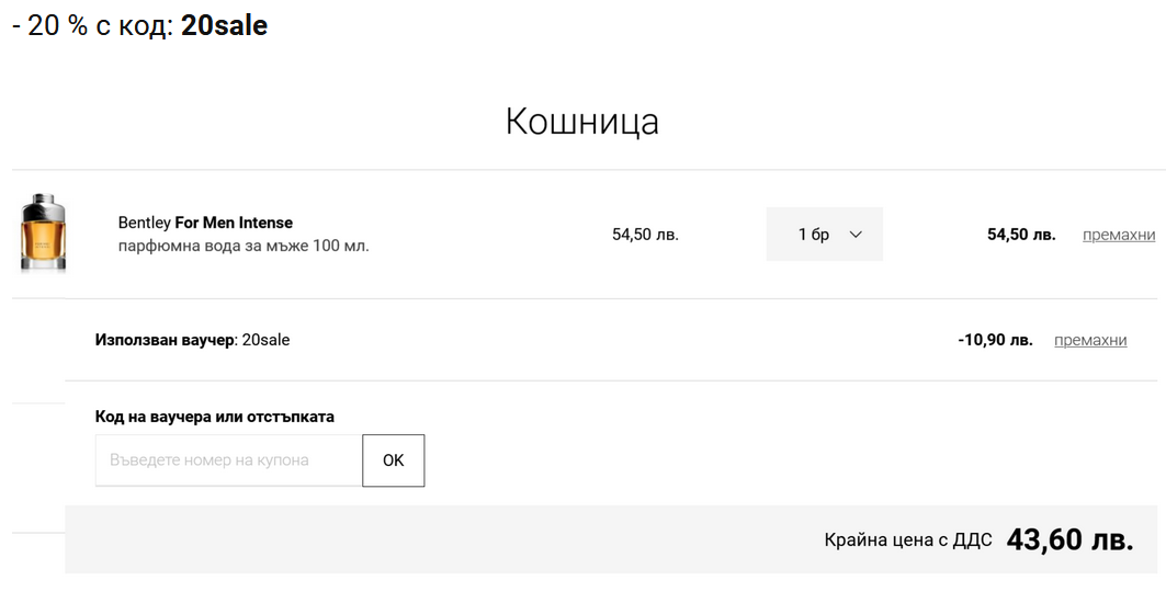 Не мога да преценя дали е добра цена 46 лв https://www.notino.bg/bentley/bentley-for-men-intense-parfjumna- … za-mzhe/p-388722/аз самата му се чудя. Милен е пускал линк и най-вероятно добри отзиви за него. А мен цената ме блазни за НГ подаръци.