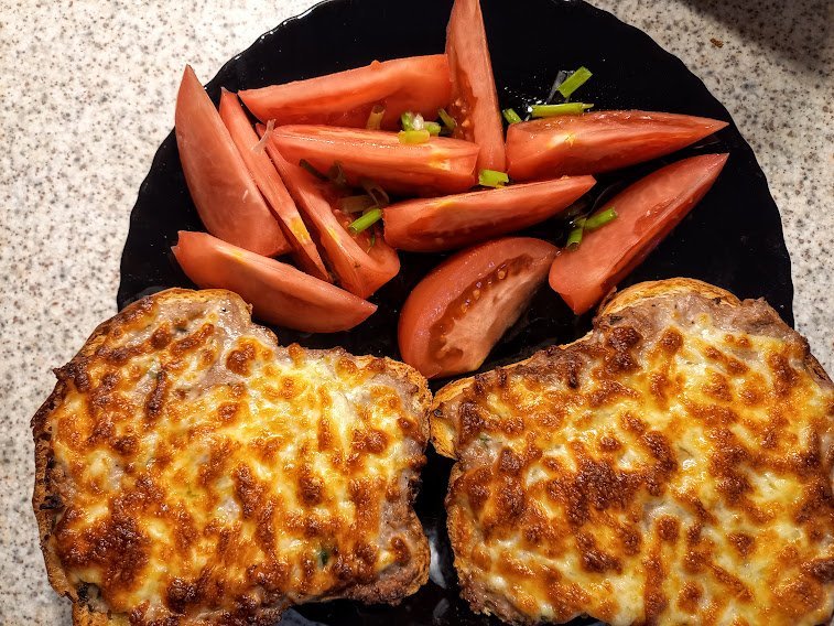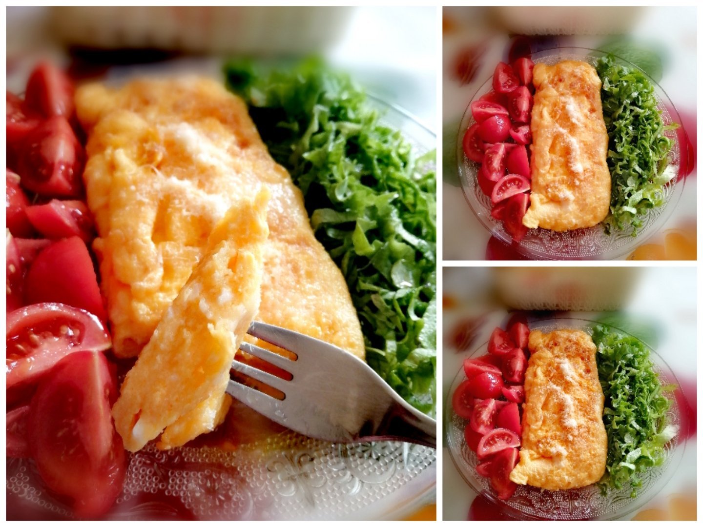 И един омлет (със стара снимка) с Гауда, гарниран със зелена салата и "бански старец" :