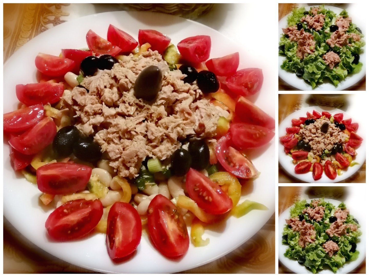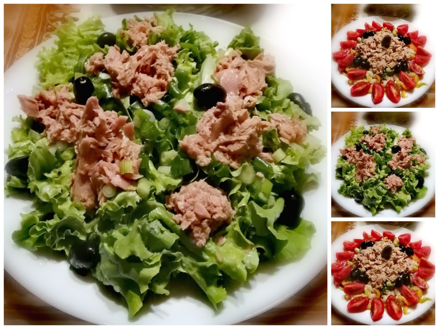 Две салати с риба тон: зелена с пресен лук и маслини и с бял боб, чери, зелена чушка, пресен лук и маслини: