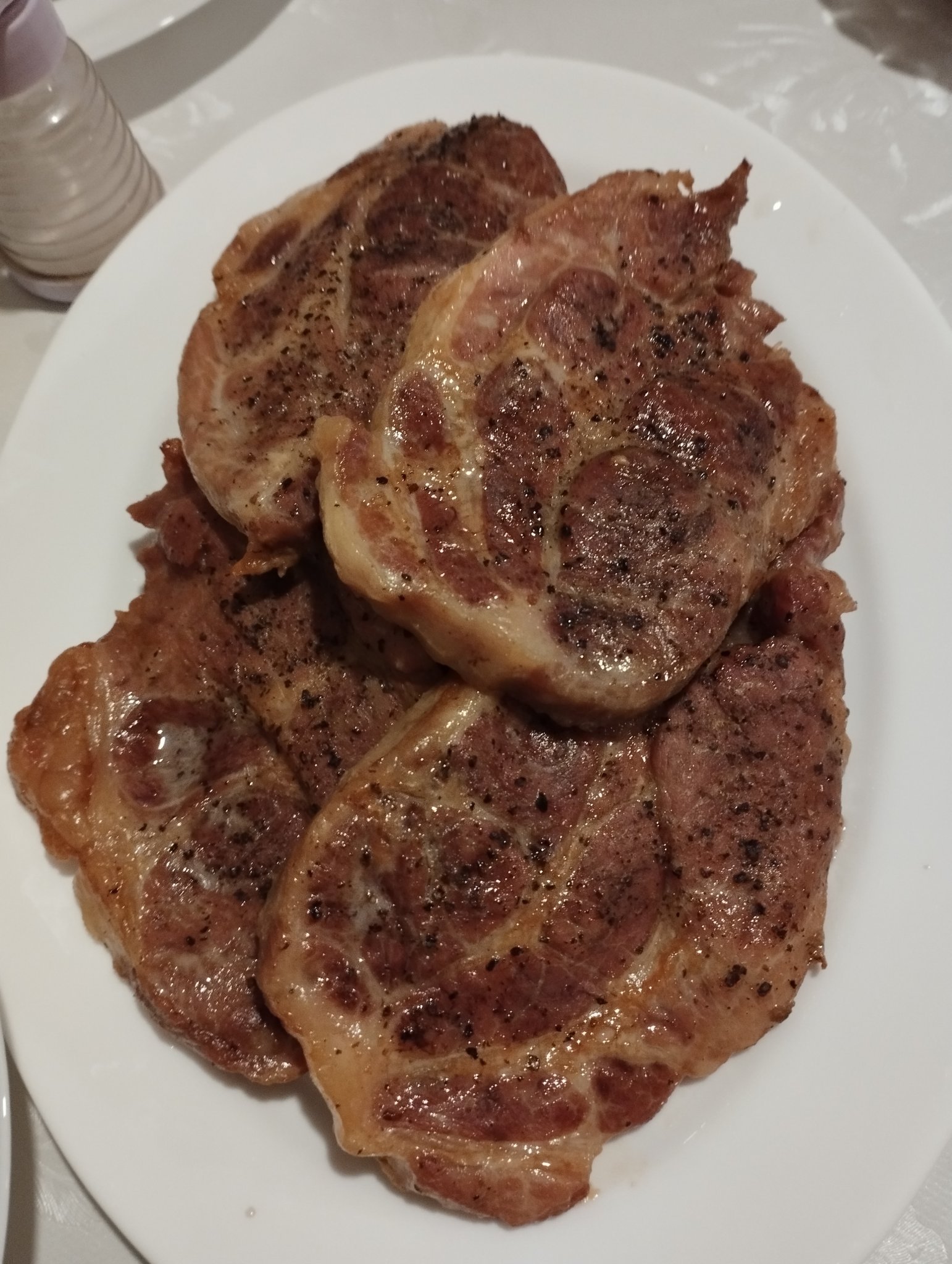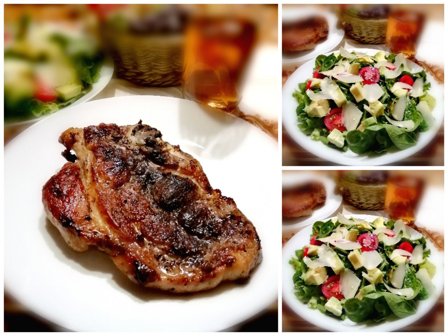 Повторка на свинските вратни пържолки на грил тиган с вариация на зелена салата с рукола, бейби спанак, перца зелен лук, авокадо, чери, пармезан и дресинг от лимон, сол и зехтин: