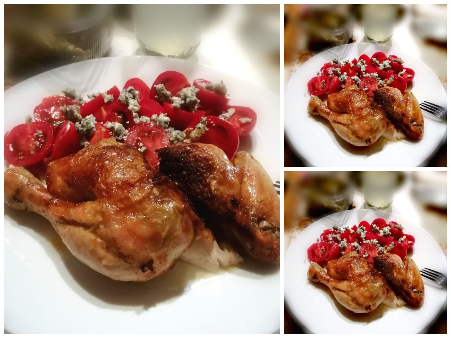 Печено пиле в хартия(по Мики Hug) с гарнитура от чери домати и синьо сирене: