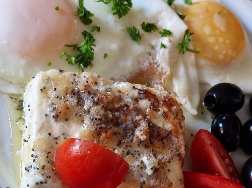 Яйца с панирано сирене, и прясно зеле с пуешко и зелени домати
