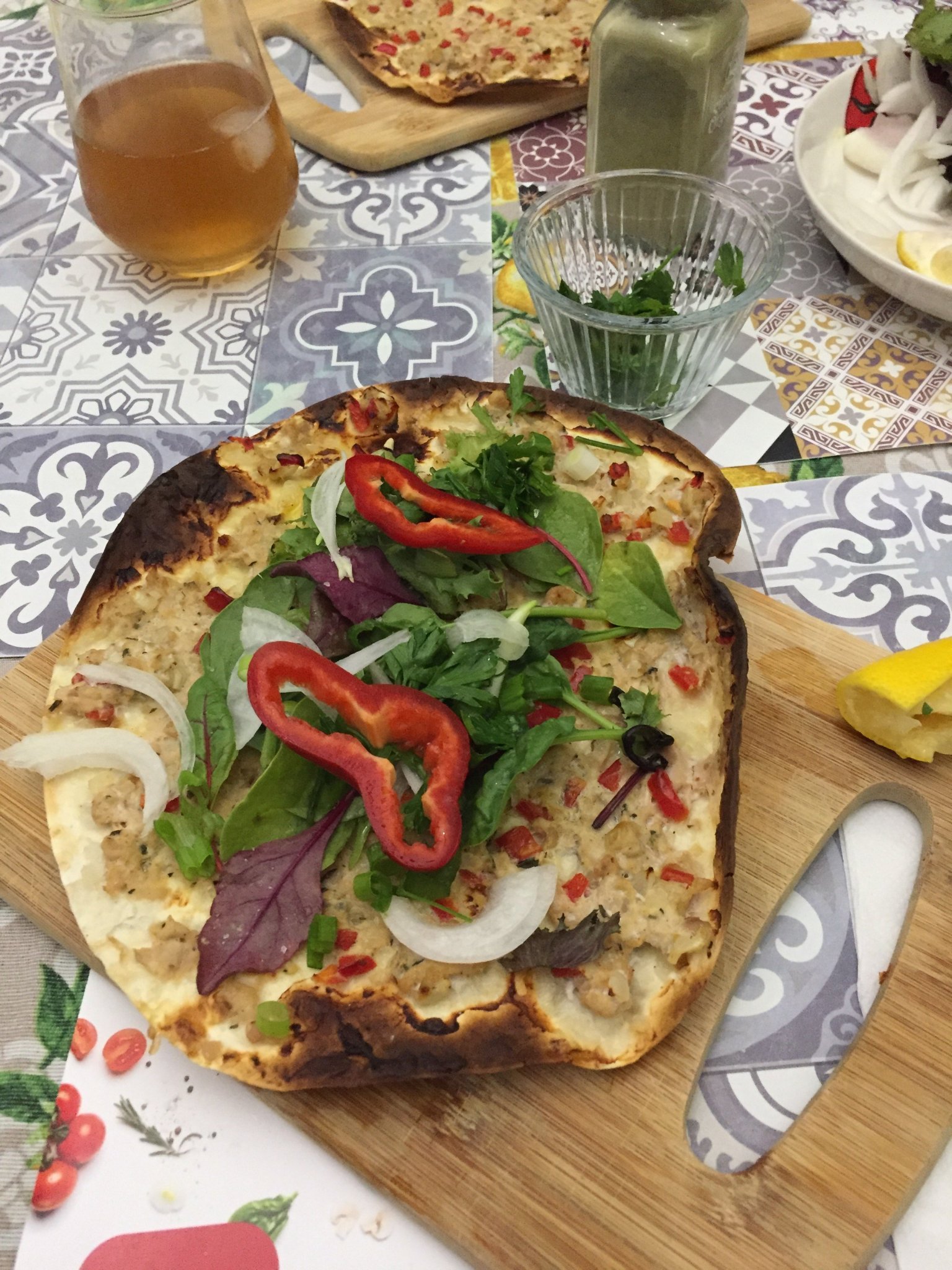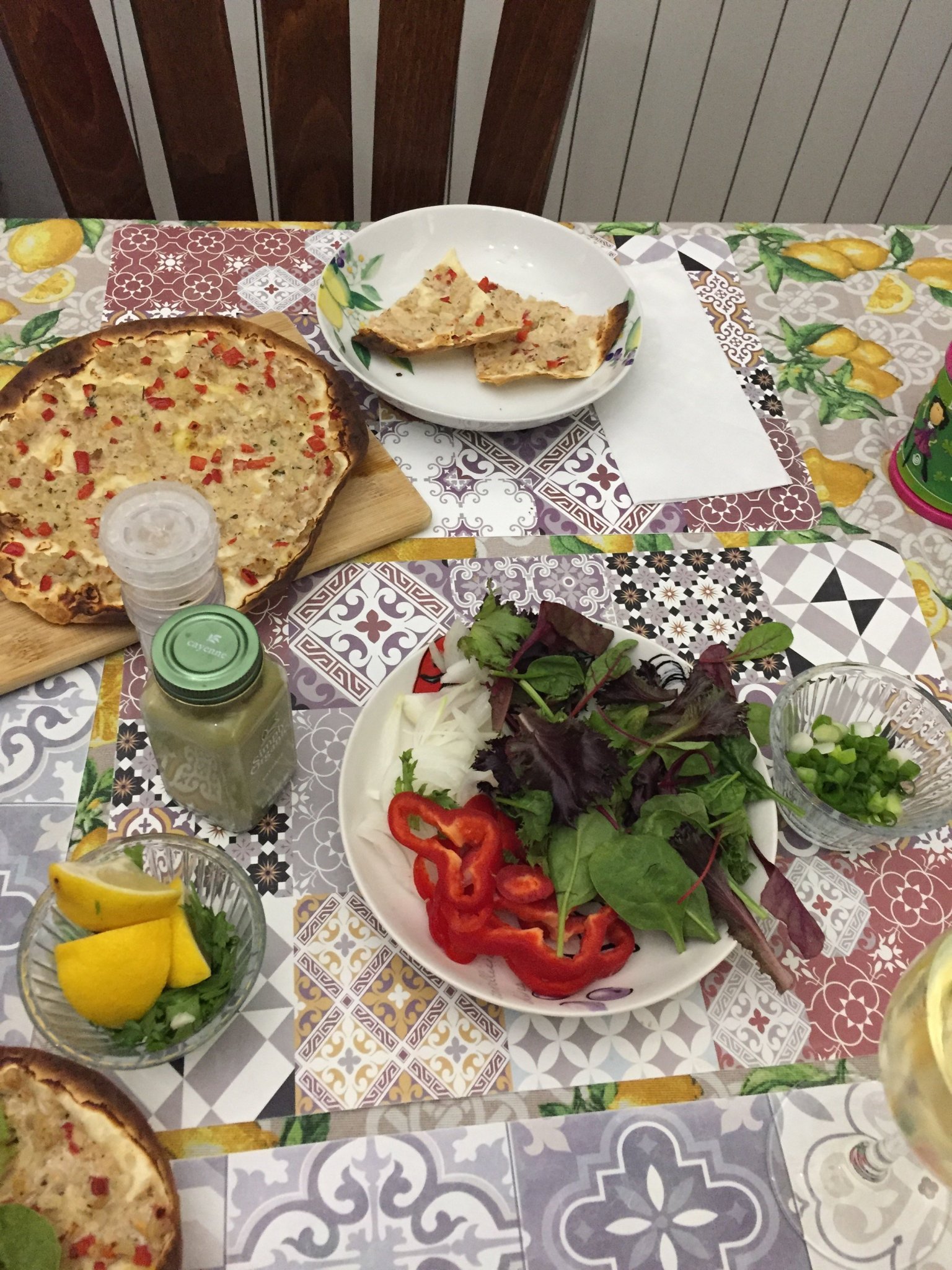 Два пъти правих бърз лахмаджун с готова основа!  Първият път с лаваш - не стана добре! Лавашът бързо изсъхва, стана ронлив, прегаря на места! Втория опит беше с тортии- те са по-жилави, стана страхотно-почти като в Турция! Всеки си добавяше екстри по желание