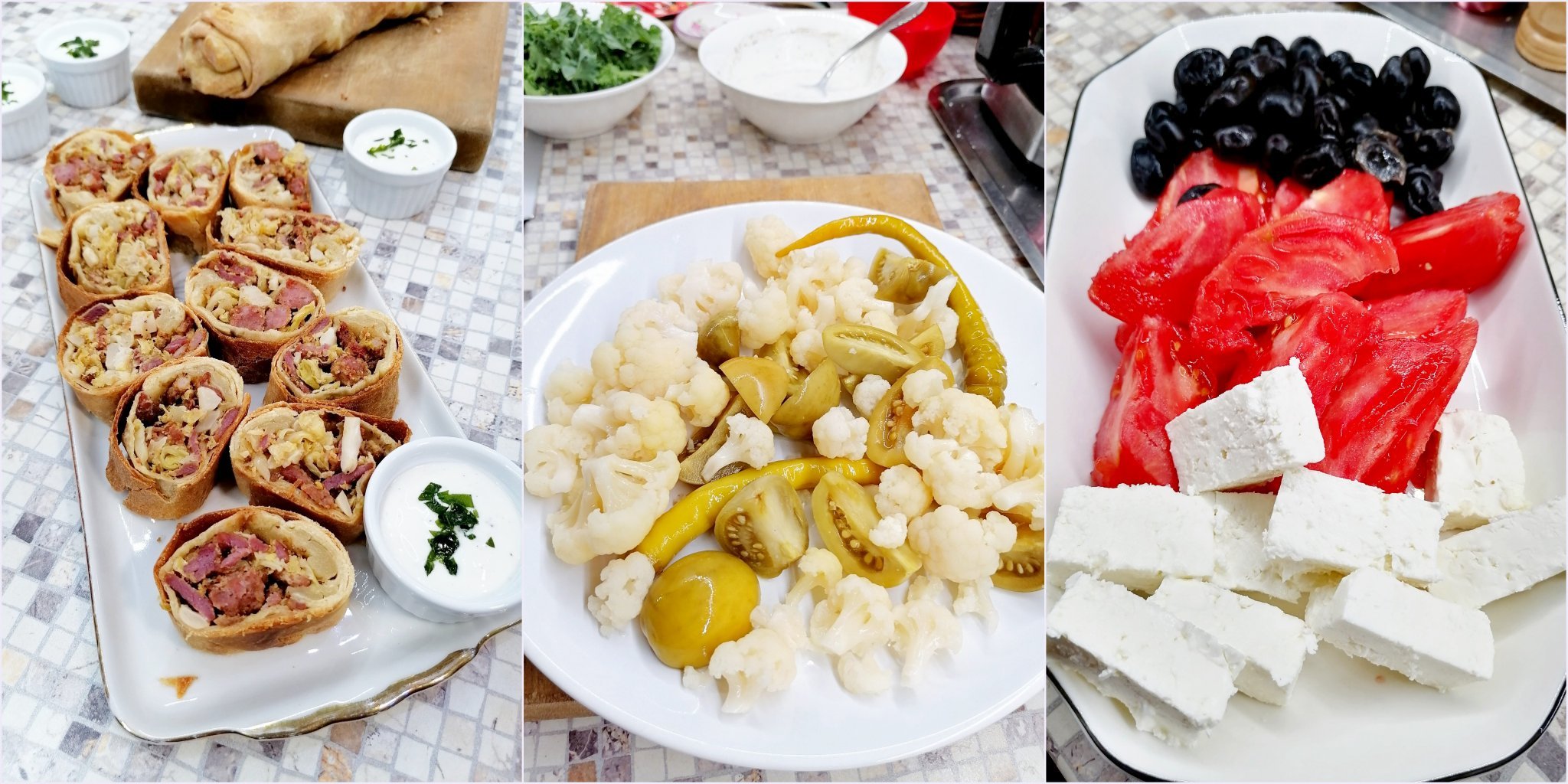 Зелеви и лозови сарми- запържени и запечени; Пържени филийки; Чийзкейк орео в чашки и накрая свински джолан с прясно зеле.