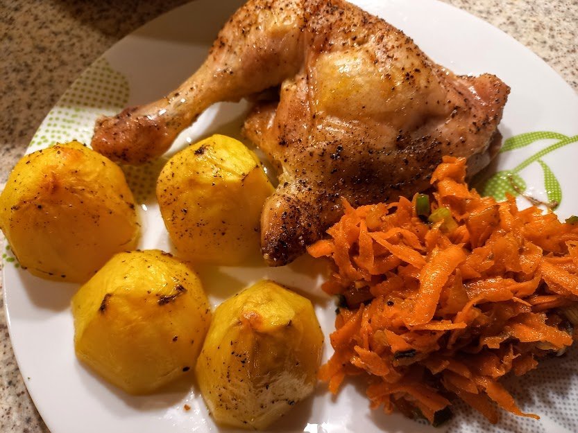 Пиле с картофи, морковка по корейски, /нямам такова ренде и на обикновено стъргах/.А за утре оставих да пържа кюфтетата от тиквички.