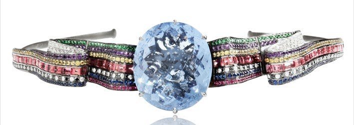 Изработена от злато, с пет австралийски каменни опала, в комплект с топазолити, хесонити, жълти сапфири, сини сапфири, черни сапфири и диаманти.