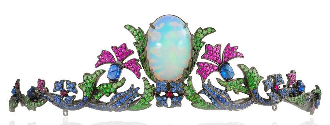 Тиарата е пълна с цвят, исторически препратки и странната креативност на Лидия, представлява клони и листа, изработени от различни на цвят сапфири, заедно с цаворити и рубини, подчертаващи впечатляващия опал Welo.