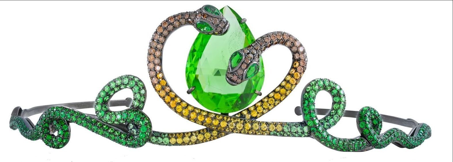 Вдъхновена от Савската царица, основният камък (перидот) е обграден от две змии, изработени от диамант, сапфир и цаворит.