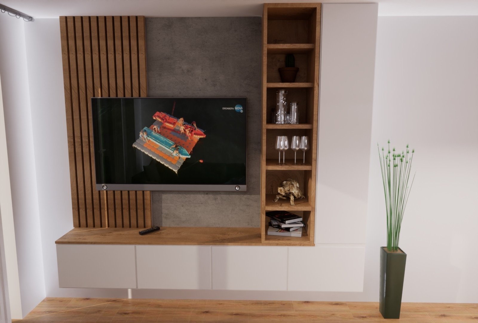 Материалите са сив и бял мдф agt supramat, който не оставя пръсти. Плот и гръб Egger чикаго светъл. Има и Тв модул със същите материали