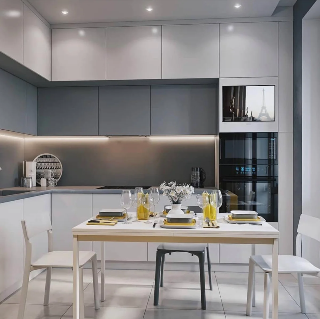 Нещо като това на снимката, само дето вместо уреди си е стената на колоната с комините, но по-навътре, наравно с долния ред шкафове. Е, ще се наложи да прежалиш луничките, които ще се скрият. Евентуално ще се наложи и козирка с нови лунички.