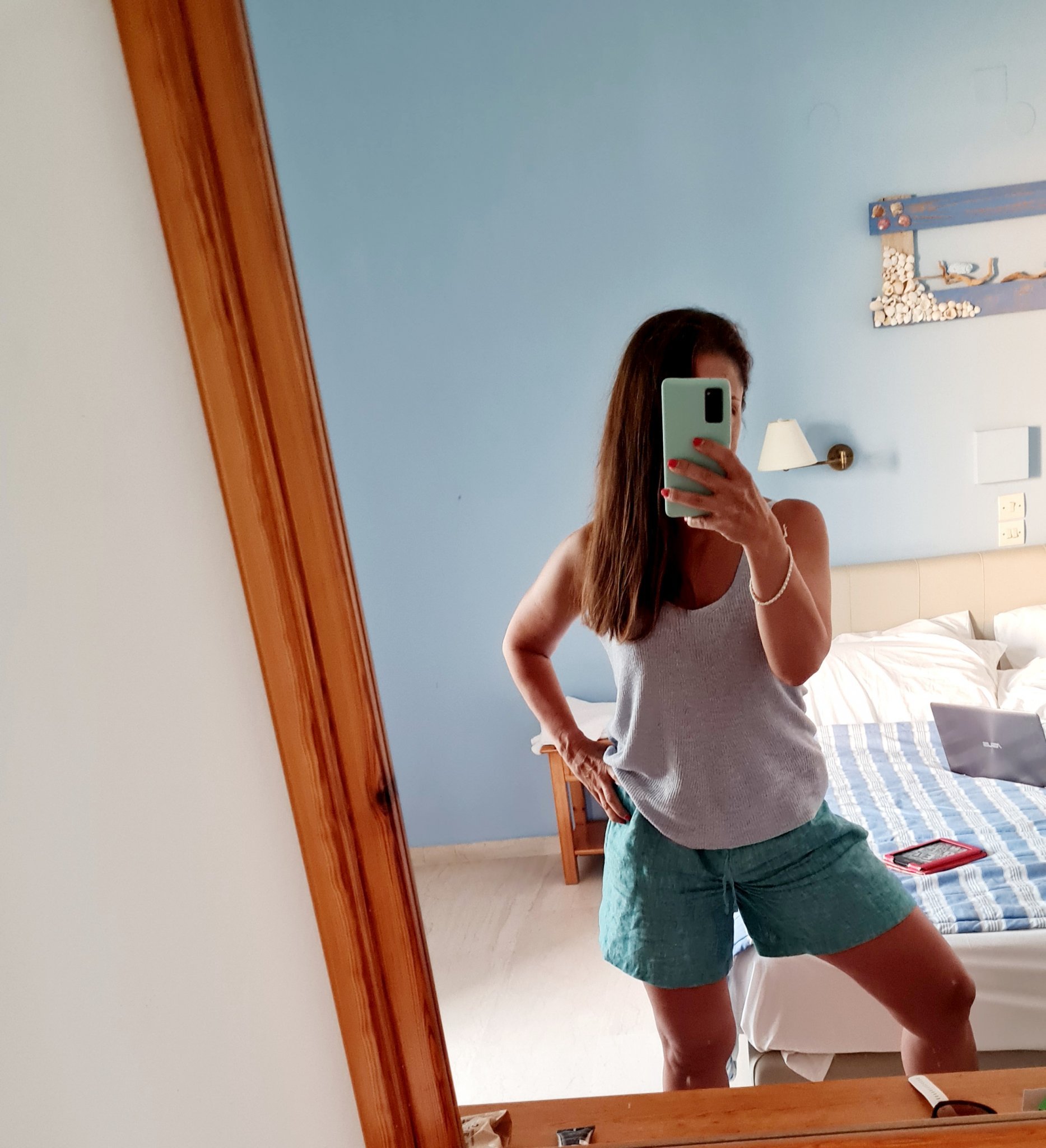 Успях да почернея доста. Тези дни само на плаж ходя, и плувам с рибите. Неглиже като за плаж, ежедневие на 46+.