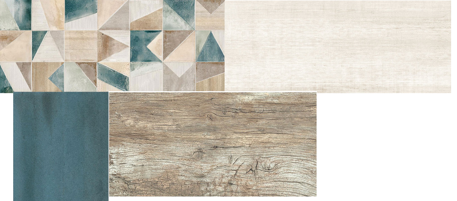 Шарените плочки са много хубави. Бих сложила от тях на ъгъл в душ прпстраннството, а отстрани нещо светличко. Тюркоазените може да са за акцент при структура за вграждане, например. Иначе, могат да се съчетаят с всеки цвят от шарените, но би било добре да е нещо светличко.