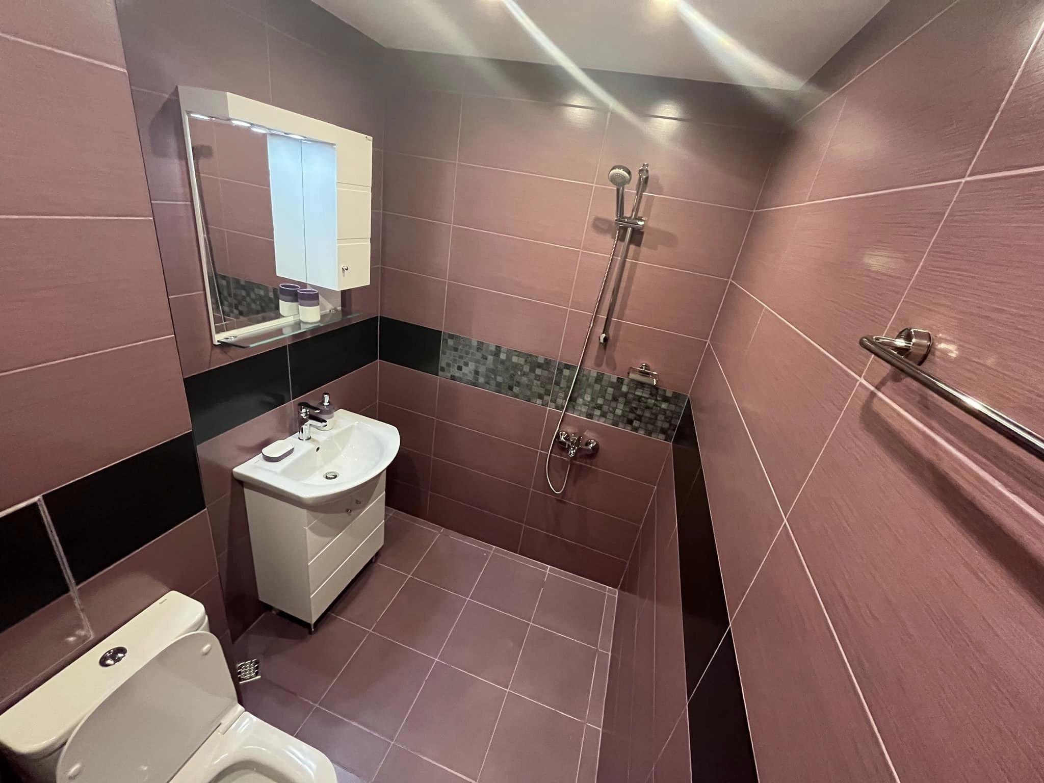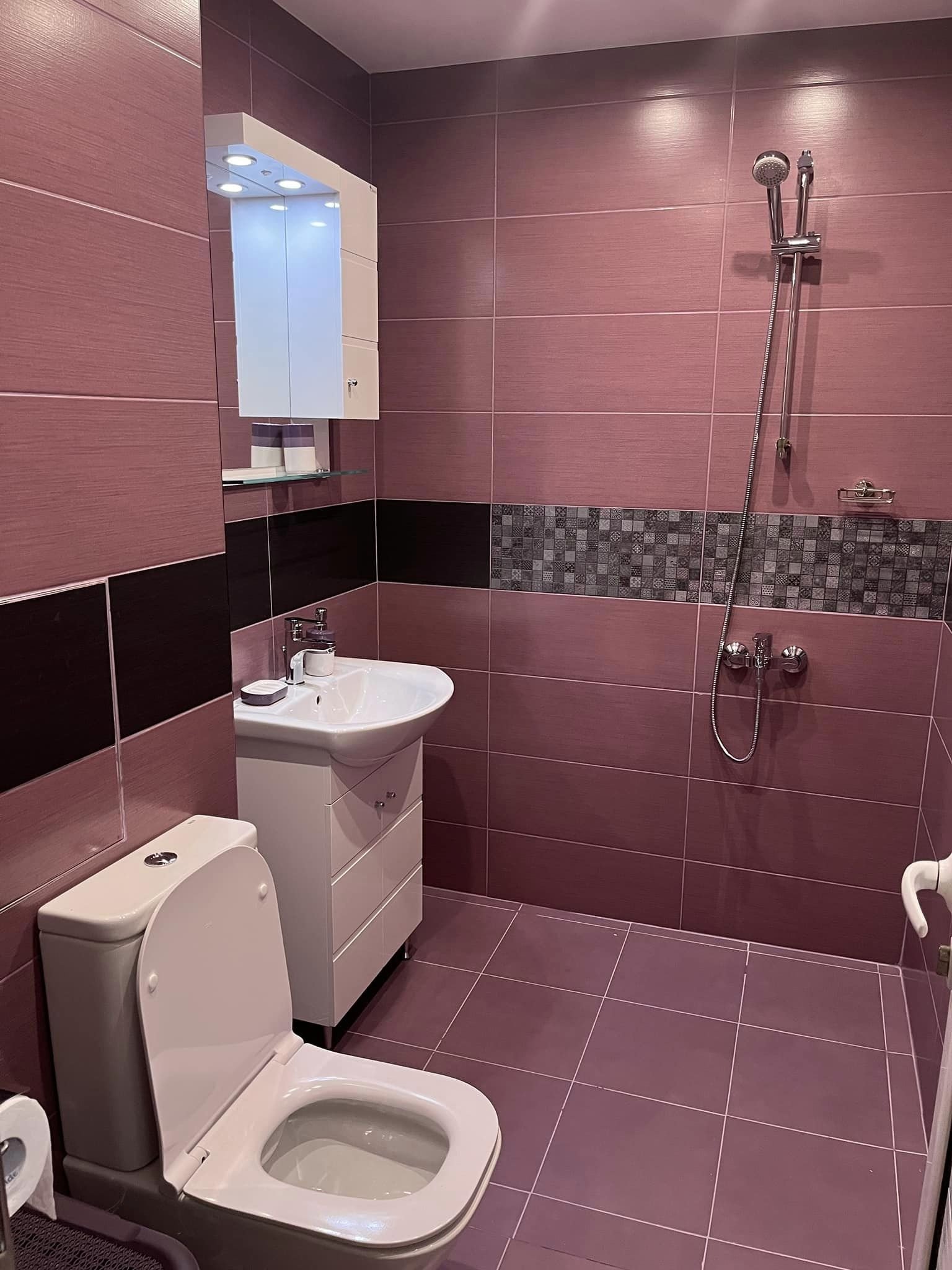 След 16 дни нерви е време да се похваля, че оцелях и след този ремонт. Много съм доволна, защото успях да коригирам всичко, което с години ме дразнеше. Разбира се, камерата на телефона не показва реалния цвят на плочките, които са лилави, не розови.