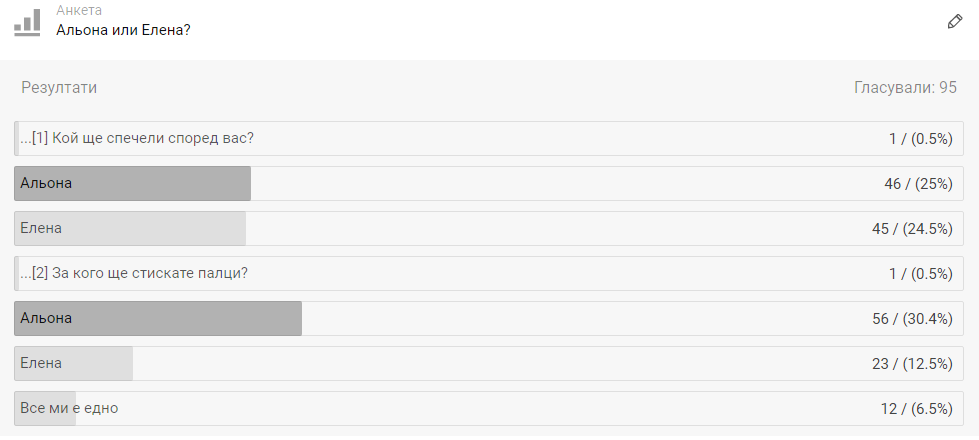 Альона в фаворит, ама Елена е от малкото симпатични нови и за това са близки резултатите.