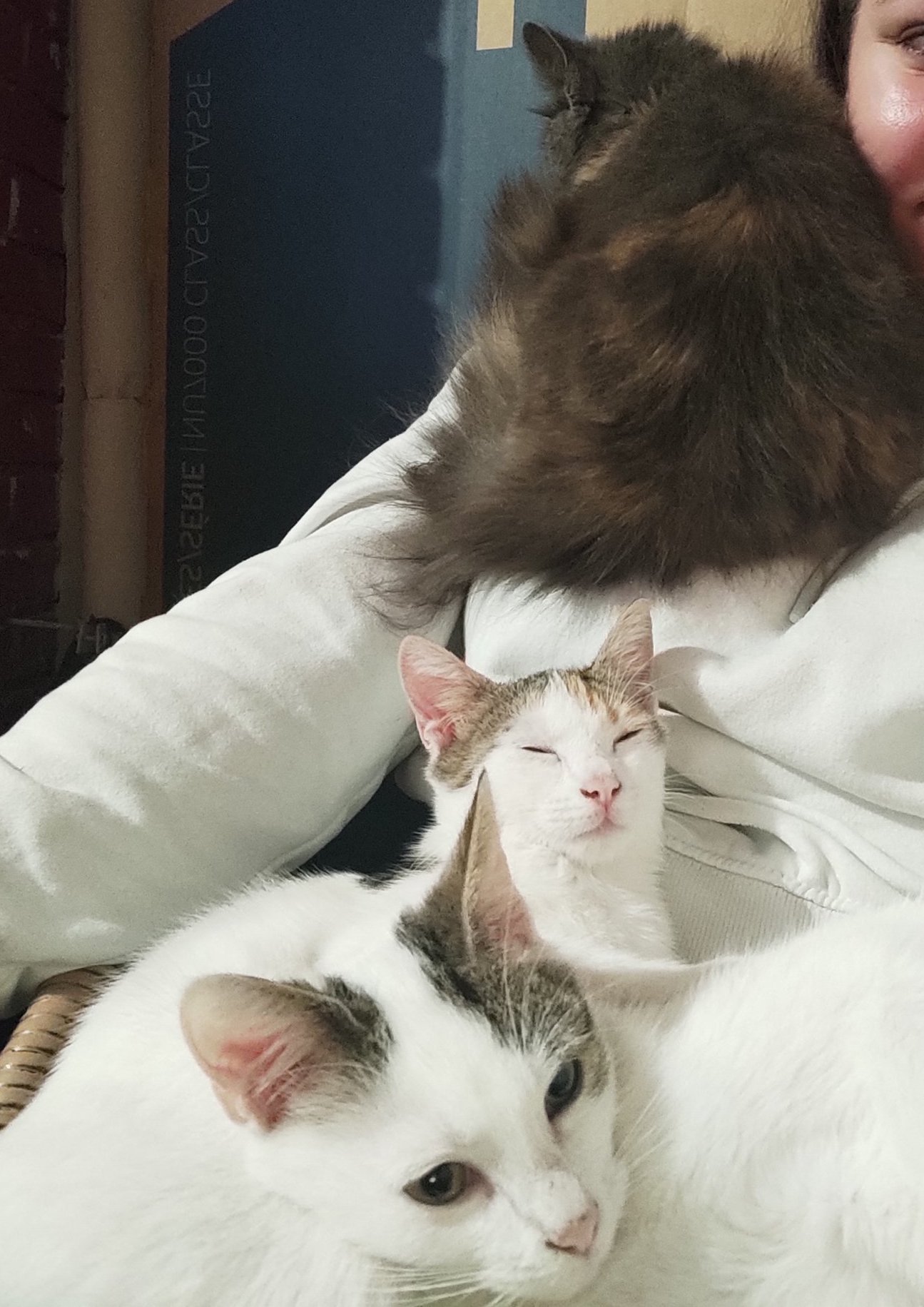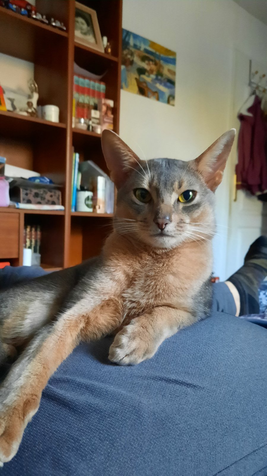 Пуфльо си беше легнал върху гърдите ми с лапки увито да ми дърпат ръцете да не шавам. Така прави, като усети, че съм се сдухала. В един момент скролвам на едно коте по фейса, и към края на клипа така се разкикотих, че милото го стреснах и избяга 😁 Сега го прикотквам обратно