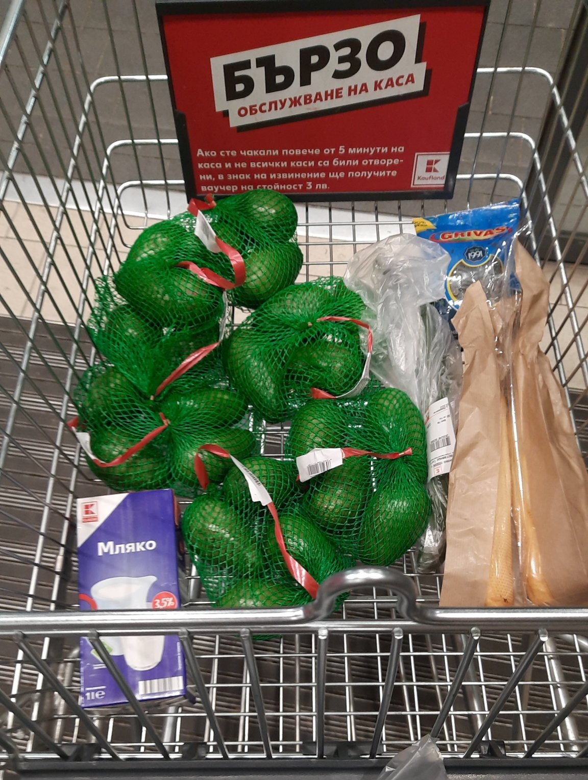 Тази вечер влязох уж само за мляко, но как да устои човек на мрежа с авокадо за 1,10 лв?😃 Награбих 6 мрежи. Една краставица за 17 ст. (58 ст./кг, но нямаше избор, жълтееха повечето).