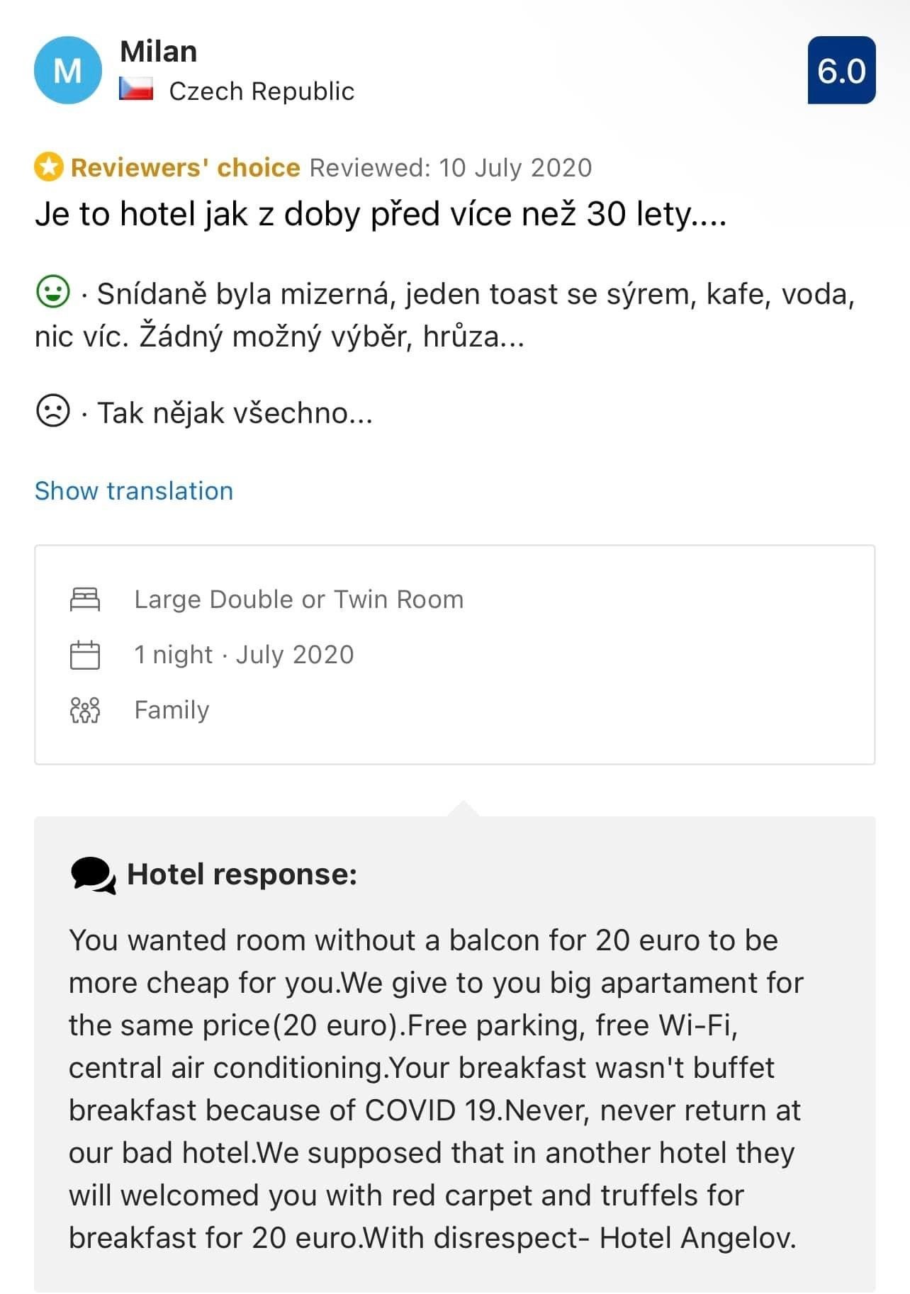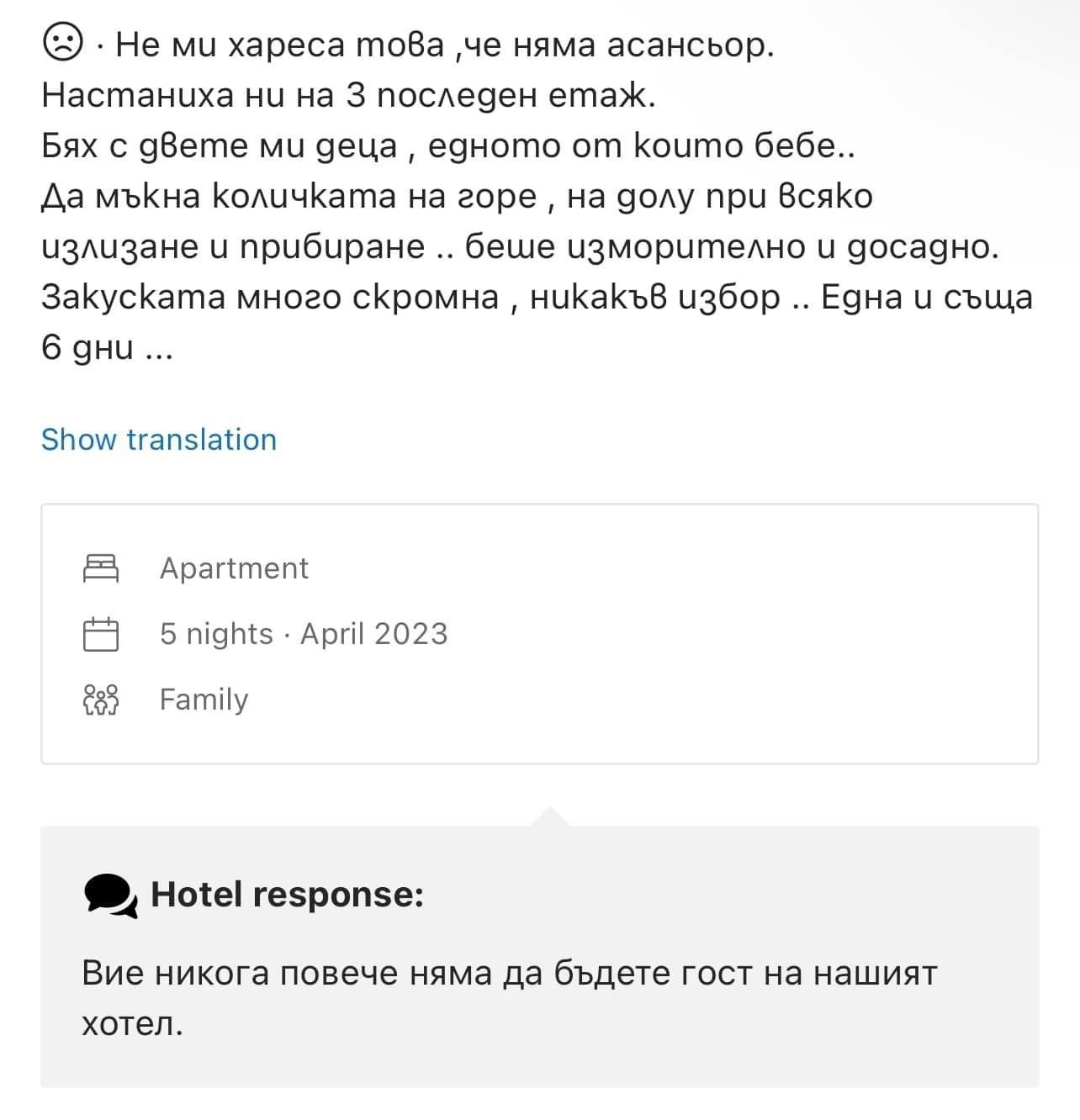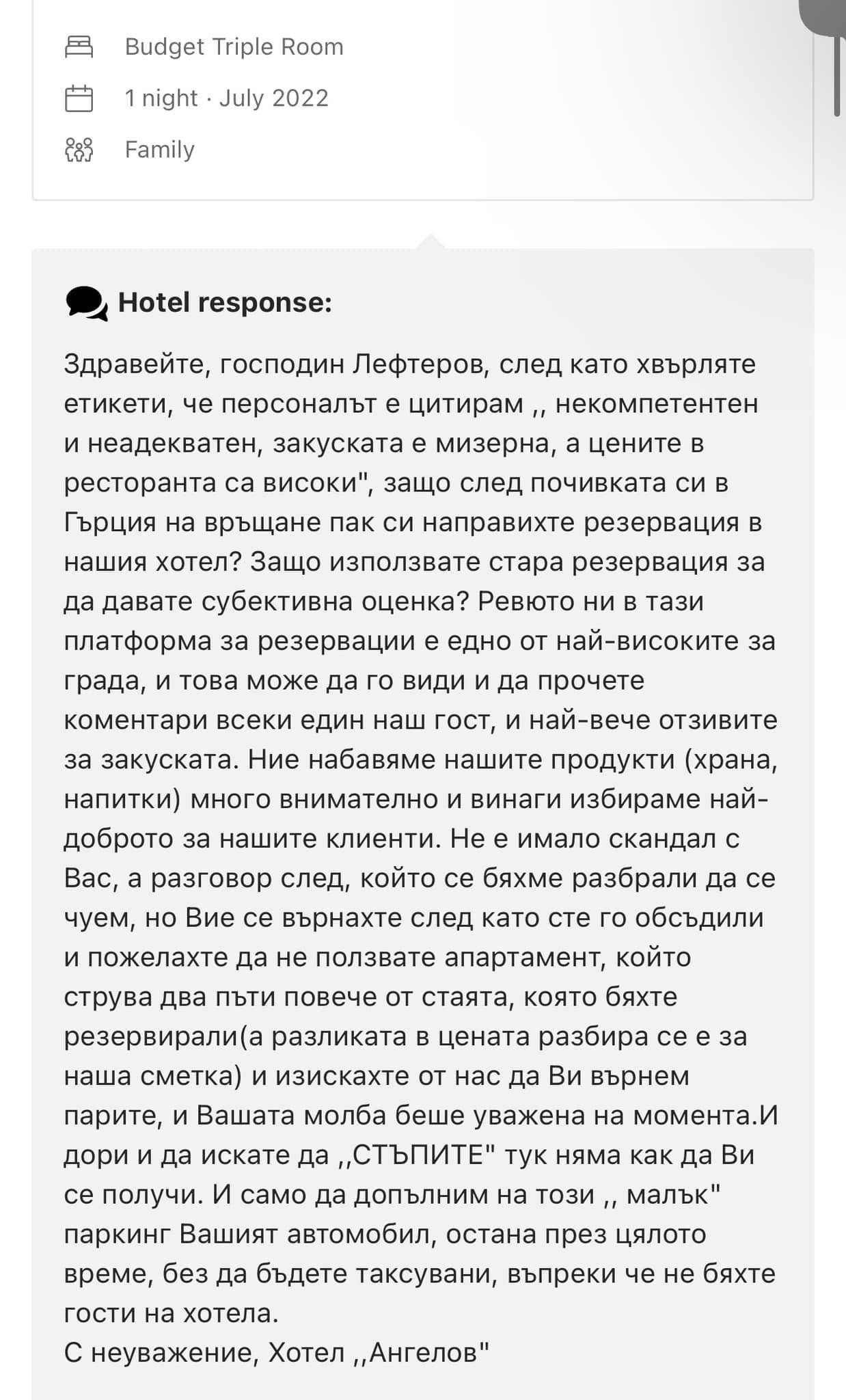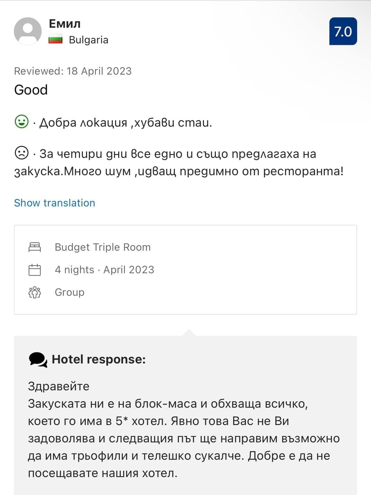 Този е абсолютен селяк. Набързо ще си фалира хотелчето с това отношение към клиентите. Сигурна съм, че и към служителите му е подобно...