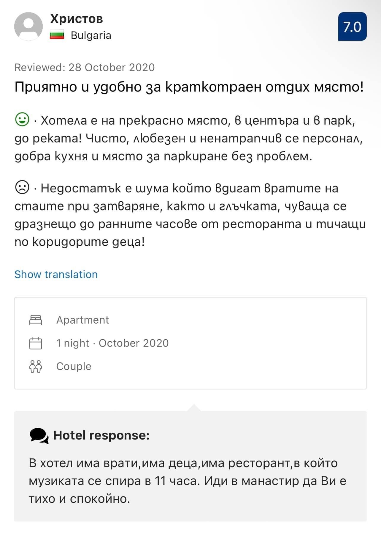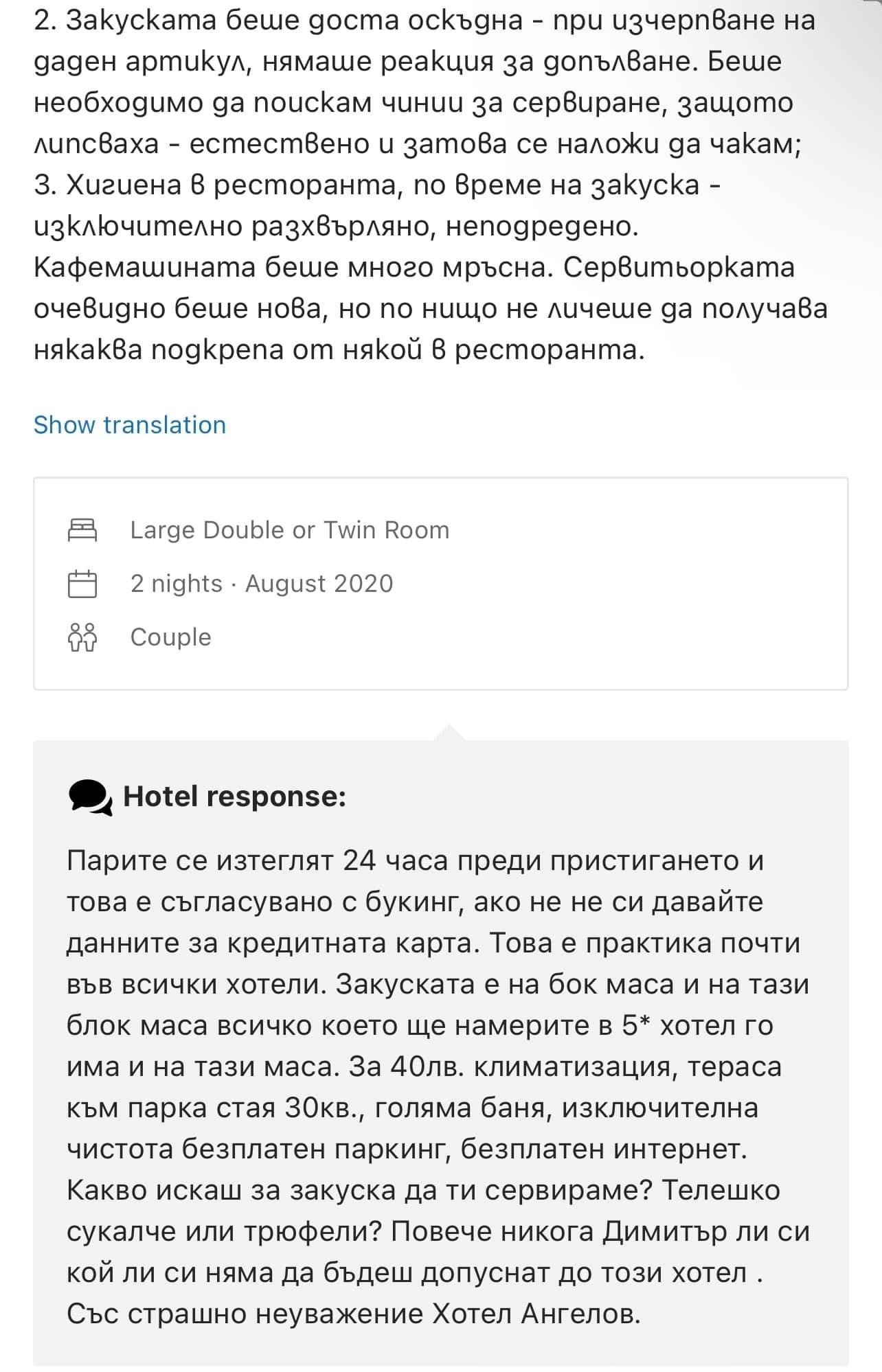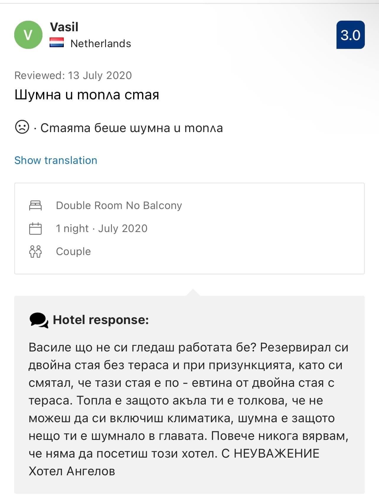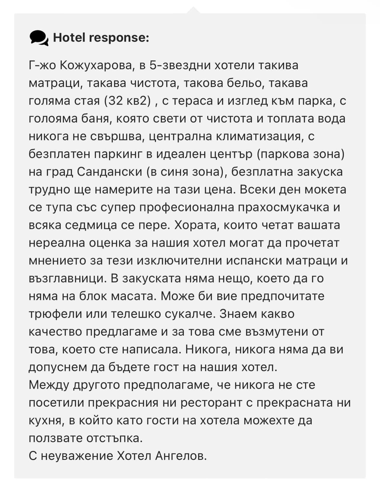 Малко да разведря. Публикувам 12 скрийншота на абсолютно реални коментари в букинг.Ком. Обърнете внимание на отговорa на хотела (Hotel Angelov, Sandanski)