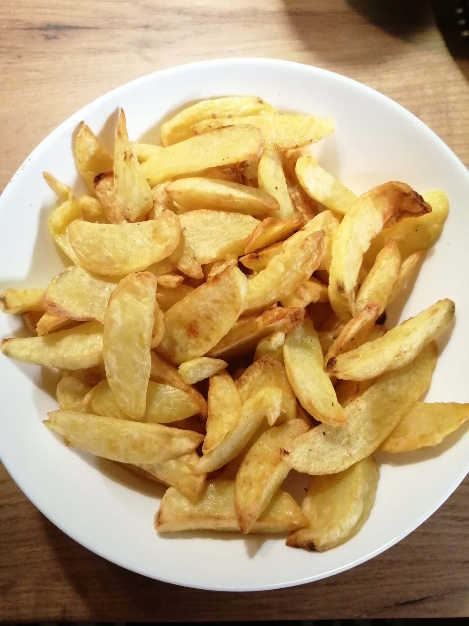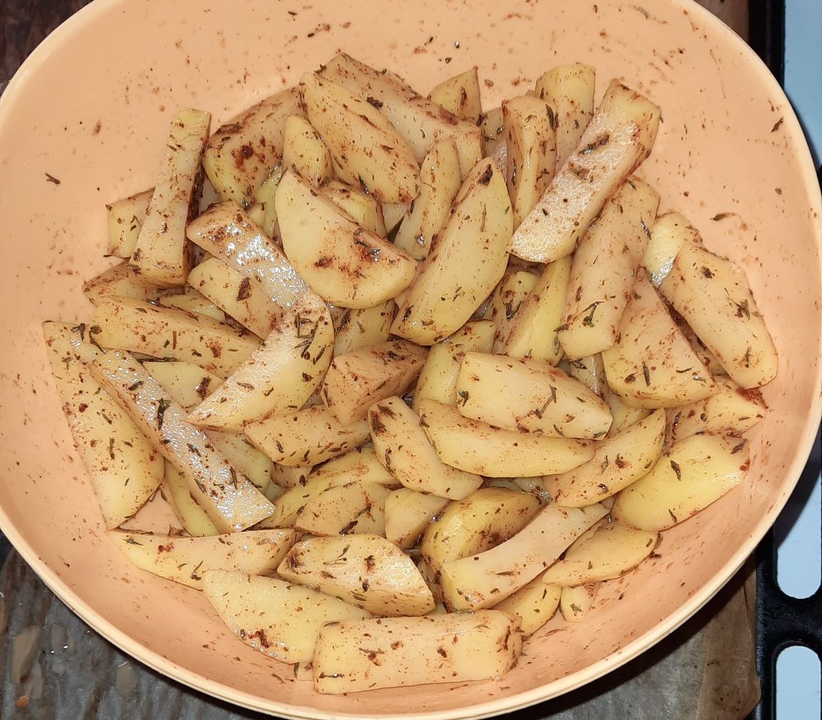 Повечето картофи бяха много малки, тях режа на две и после на "пръчици", обаче си изглеждат като полумесеци накрая.🙂