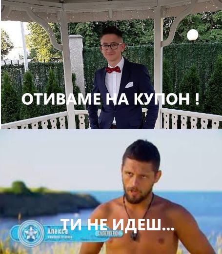 Аз не знам дали ще е номиниран, вероятно да, съдейки по реакцията му и аз така си мисля, но ако ще отпадат двама утре, както си мислех, за да ги докарат 6-6-6, или по-скоро 18 - за две племена, то наистина вероятно ще са Касим и Цецо. И Звезди, жената, която наистина е напълно безполезна, ама напълно, ще поостане поне още една /надявам се само една/ седмица. За Вики ще се радвам ако продължи напред и остане колкото се може по-дълго, опитвам се да гледам на нея като на играч, но ми е трудно точно в този случай да не смесвам с личното и човешкото. Просто защото Цветан е добродушко, ако беше някой грубиян като Алекса, или схемаджия като Илиян, или грубиян като Генчо /щото той понякога си е доста грубичък в епитетите към женското съсловие, което се приема за стратегия и откровеност/, разбираемо е - използвала го е, на война всичко е позволено. Но той е даже прекалено спокоен и търпи особено в последните епизоди отвратително отношение от страна на Миле Китич /сръбски певец, Алекса му е фен/, и въпреки това влачи, носи, тегли, вчера буквално щеше да се претрепе в стремежа си да докаже, че не е безполезен и да впечатли Виктория....и накрая - oh, shit! Дано поне си е струвало, в смисъл - съюзът им с Алекса да просъществува дълго и напоително.